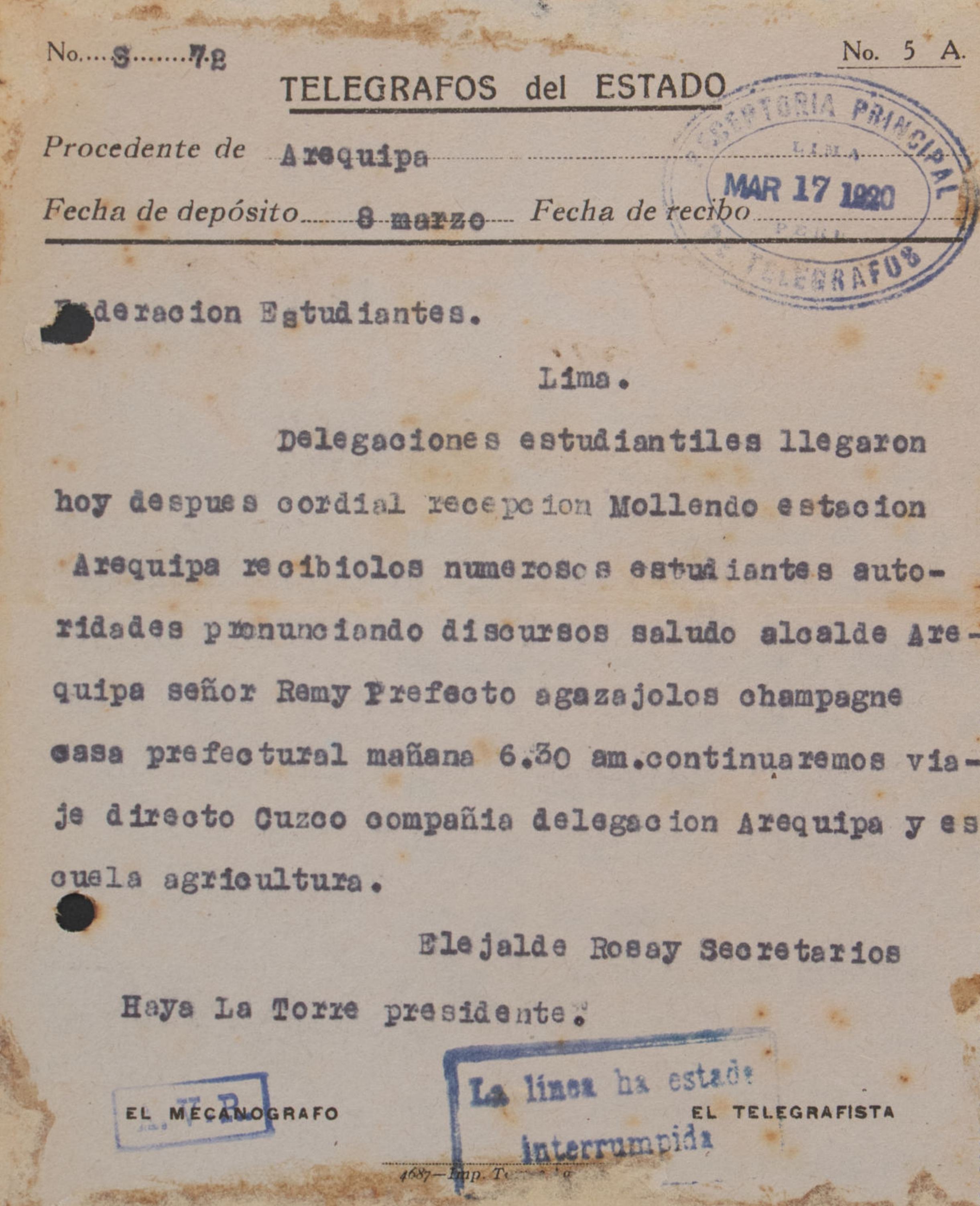 Telegrama informando sobre la recepción de delegaciones estudiantiles en Arequipa