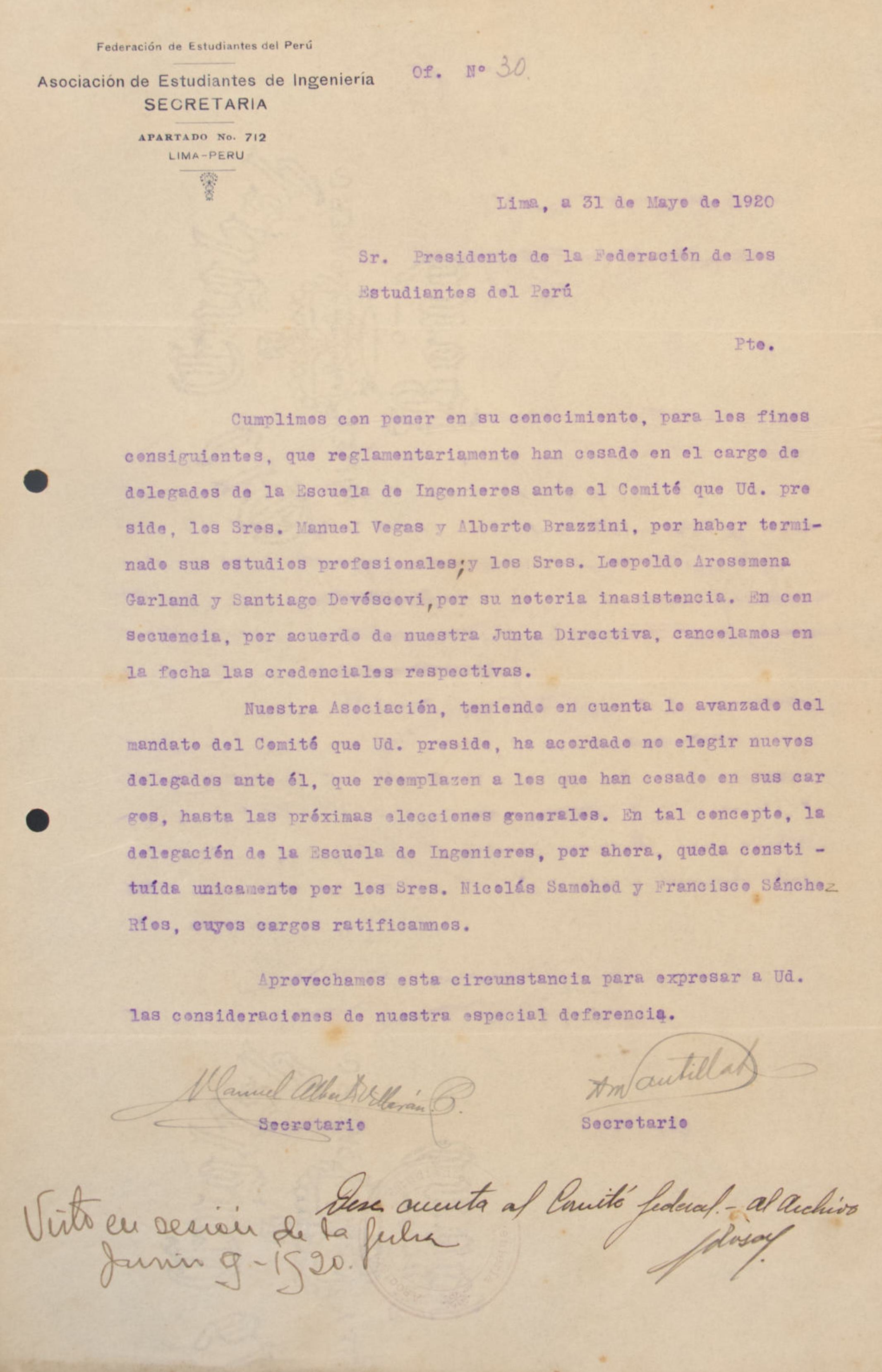 Notificación sobre cese y ratificación de delegados de la Escuela de Ingenieros ante la Federación de Estudiantes del Perú