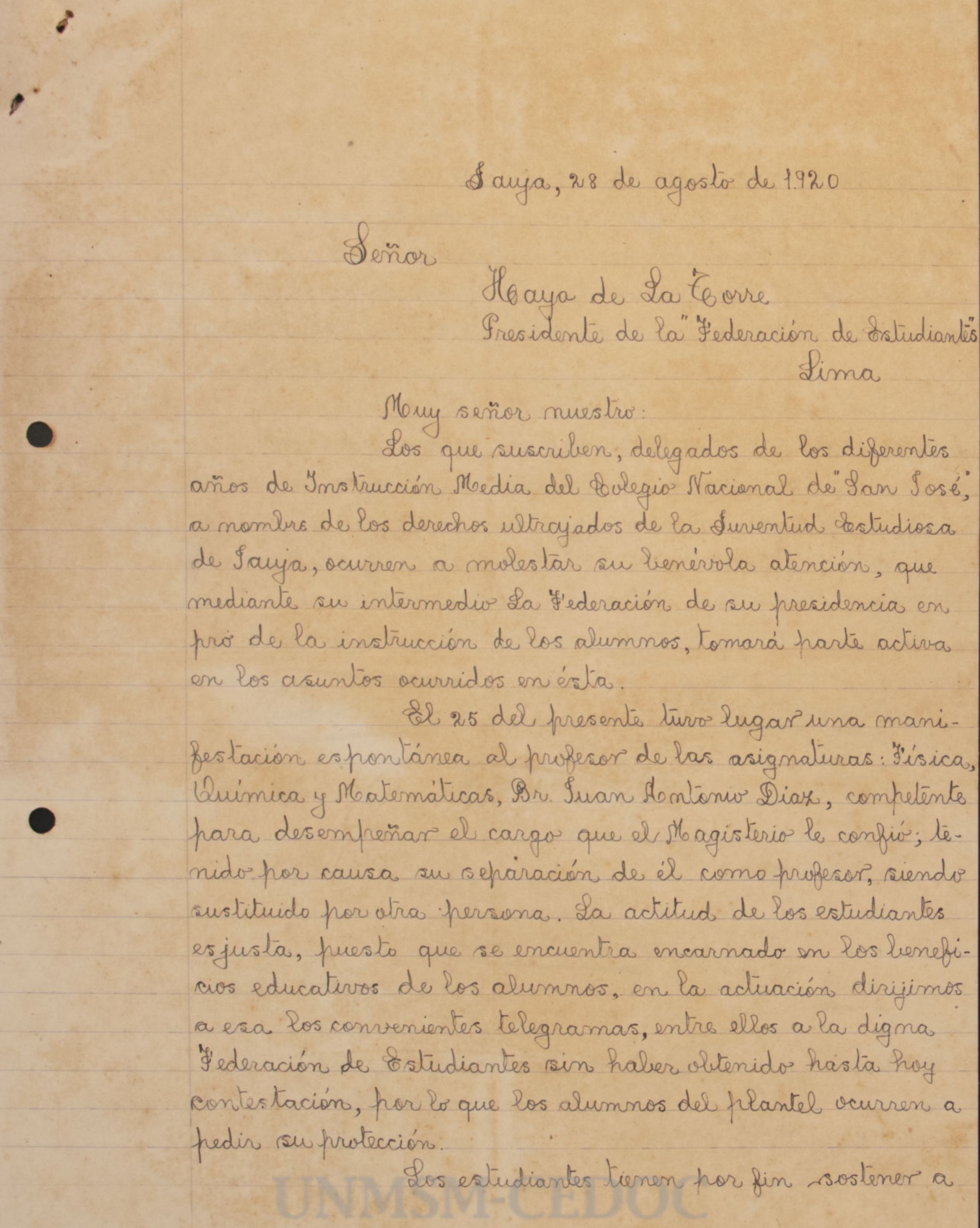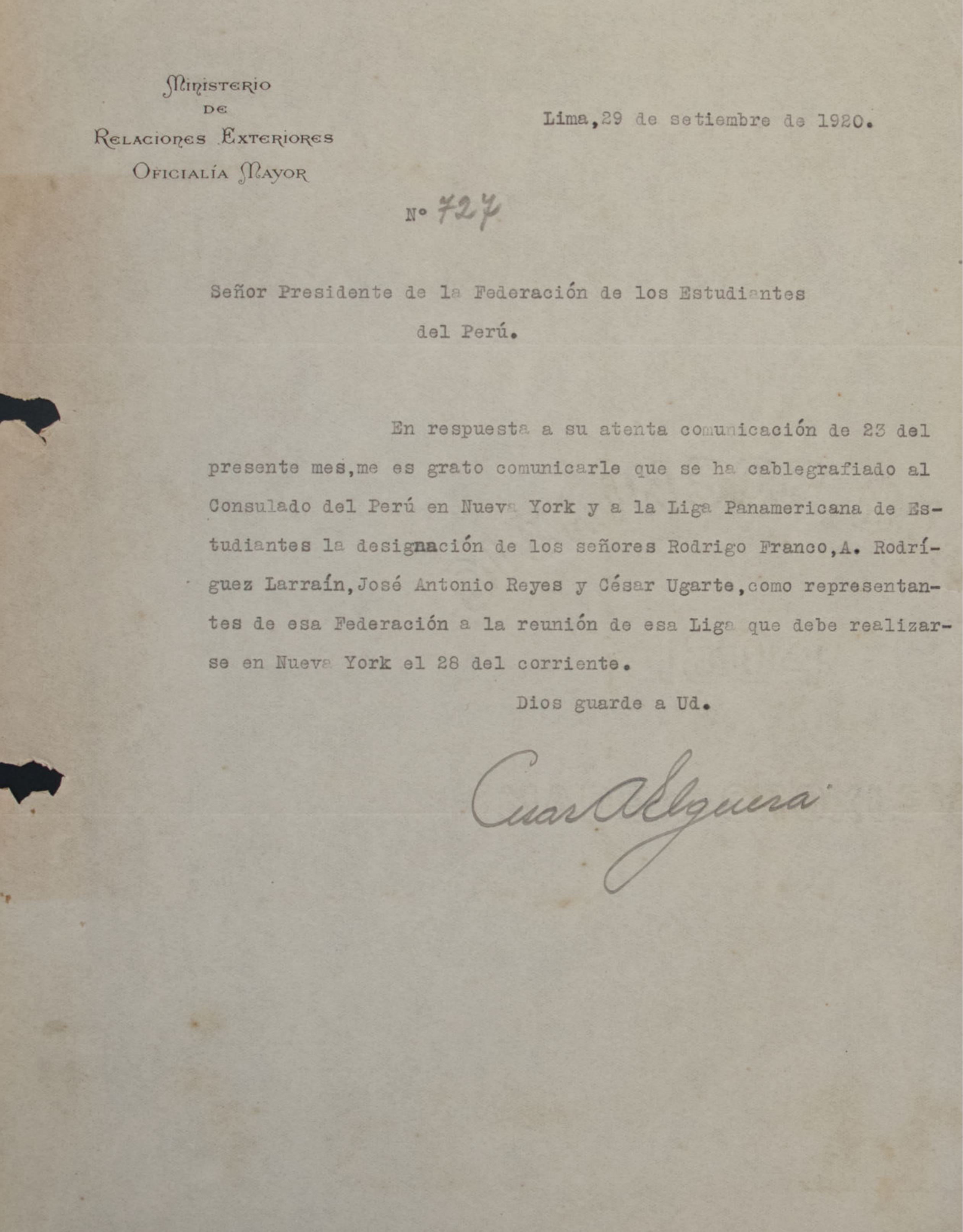 Comunicación del Centro de Estudios de Derecho, informando que en su sesión del 20 de septiembre de 1920, se eligió a Humberto del Águila, David A. Pareja y José A. Carvalho como delegados ante la Federación de Estudiantes del Perú para el próximo periodo. Solicitan al presidente de la federación que estos sean reconocidos oficialmente en su calidad de representantes.