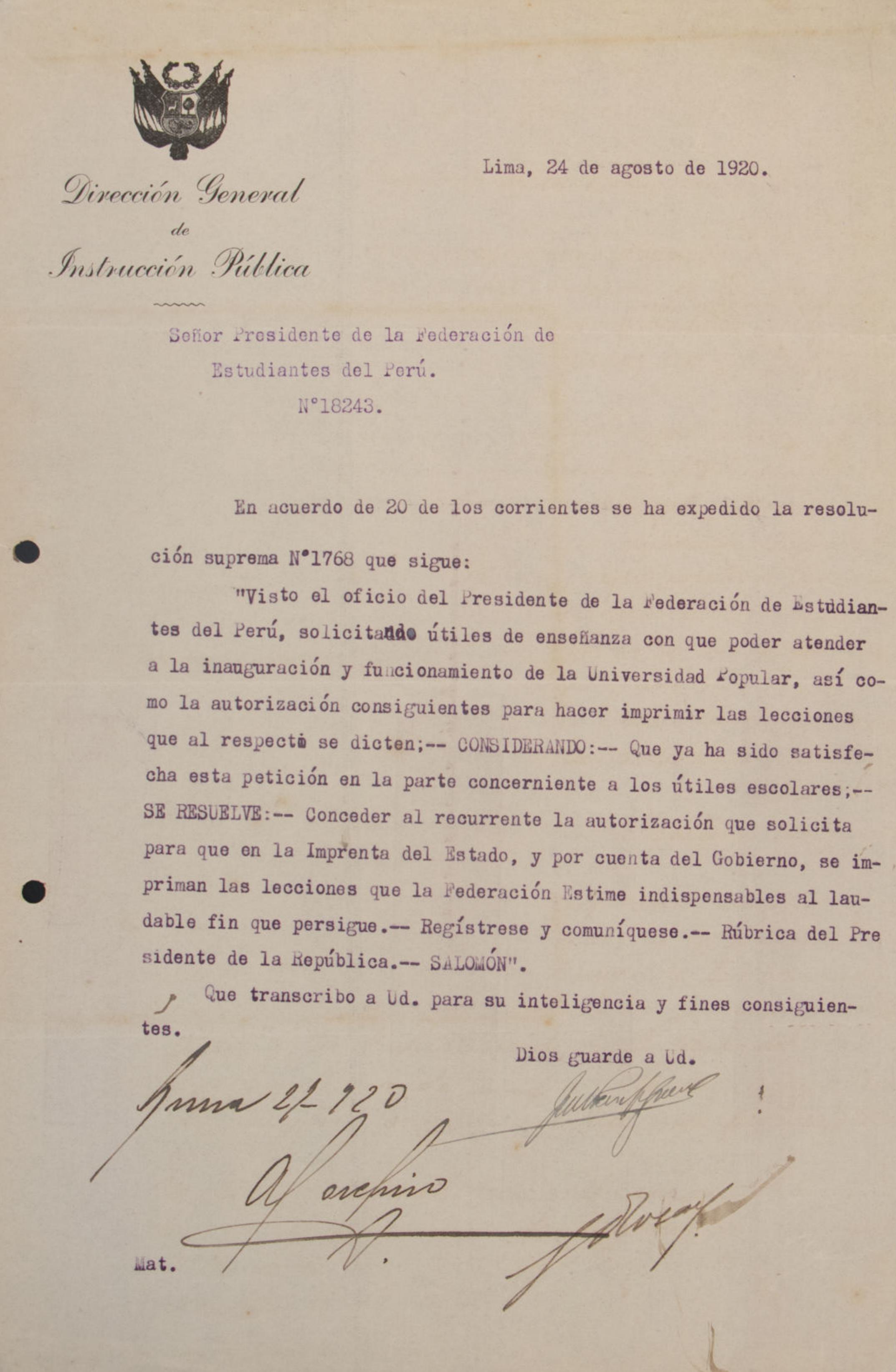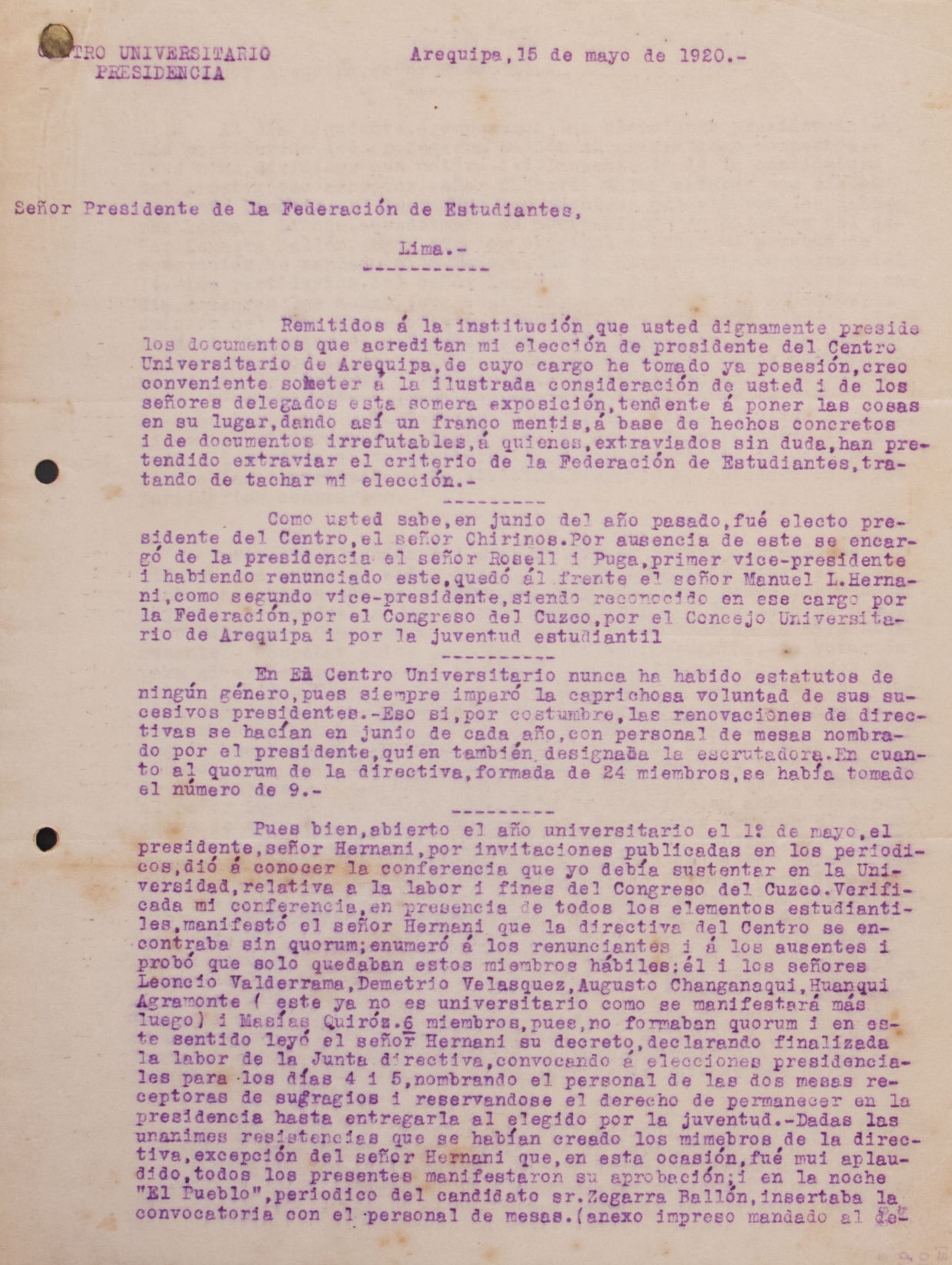 Este telegrama, enviado desde Cusco el 13 de febrero de 1920 y dirigido a Víctor Raúl Haya de la Torre, presidente de la Federación de Estudiantes del Perú, informa sobre la imposibilidad de elegir delegados debido a la ausencia de la mayoría de los estudiantes. Terro, quien firma como presidente, menciona que Calderón ha proporcionado las razones de esta situación y señala que, debido a la amplitud de libertades en los centros federados, se requiere un aplazamiento. De lo contrario, Cusco no participará oficialmente, aunque recibirán a los asistentes con afecto y cordialidad.