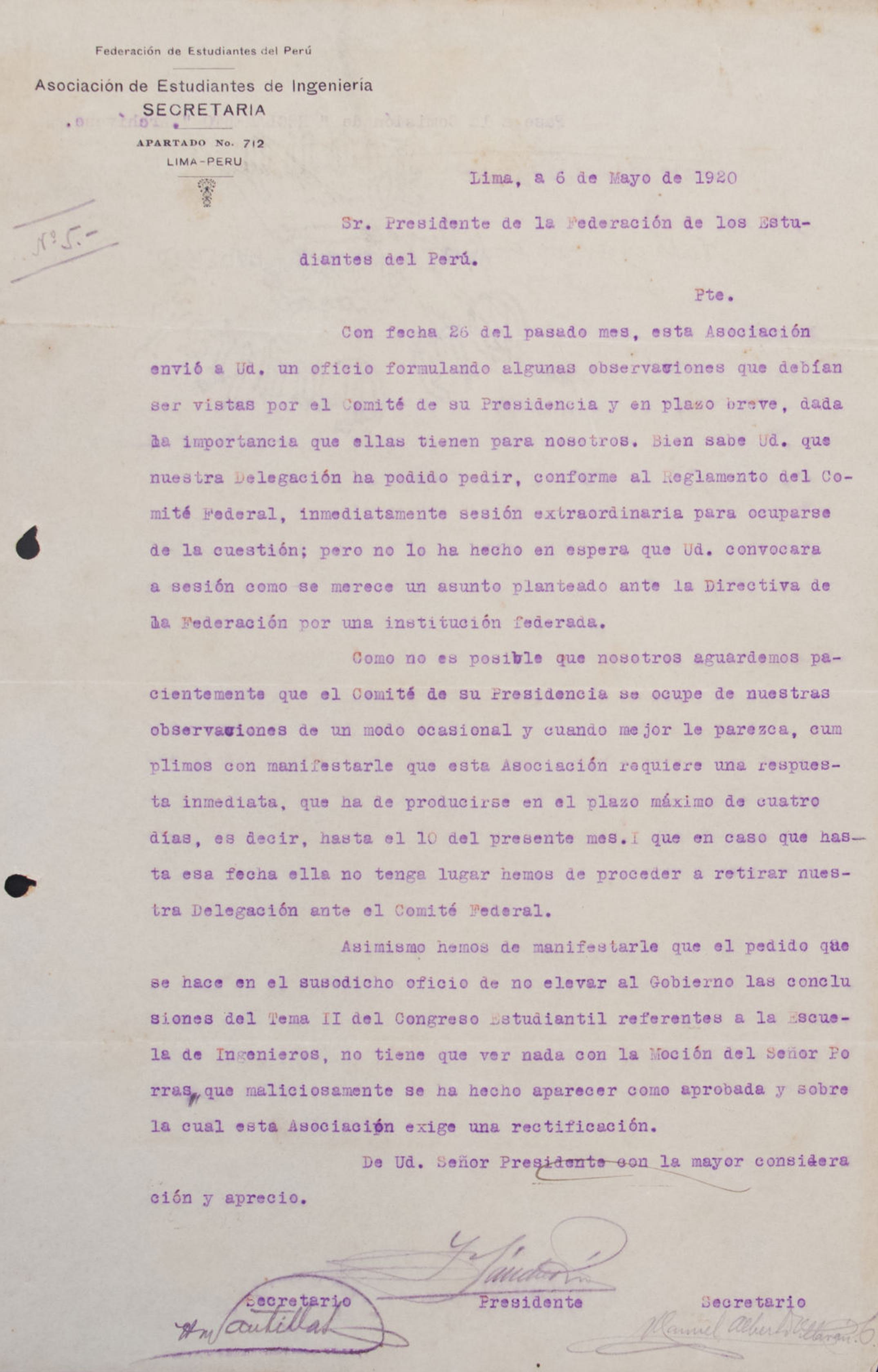 El rector Alberto A. Giesecke de la Universidad Nacional de San Antonio Abad del Cusco ratifica, mediante telegrama, la elección de los delegados Ríos Pagaza y Roberto Frisancho por el Centro de Jurisprudencia, así como Luis Ugarte y Alberto López por los Centros de Ciencias Naturales, ante la Federación de Estudiantes del Perú.