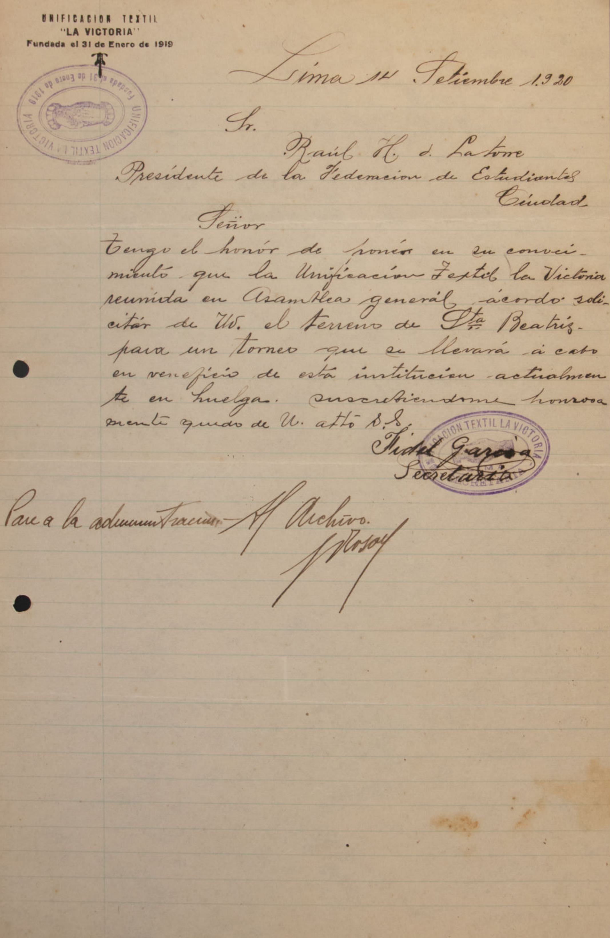 Carta fechada el 14 de febrero de 1921, escrita por José Ausejo al presidente de la Federación de Estudiantes del Perú. En esta carta, Ausejo presenta su renuncia al cargo que le fue conferido por el comité de la FEP, como miembro de la Comisión de Concursos y Conferencias. La renuncia se debe al fracaso del dictamen presentado por el presidente de la comisión, lo cual, a su vez, provocó que el señor Carlos Ríos Pagaza retirara sus mociones.