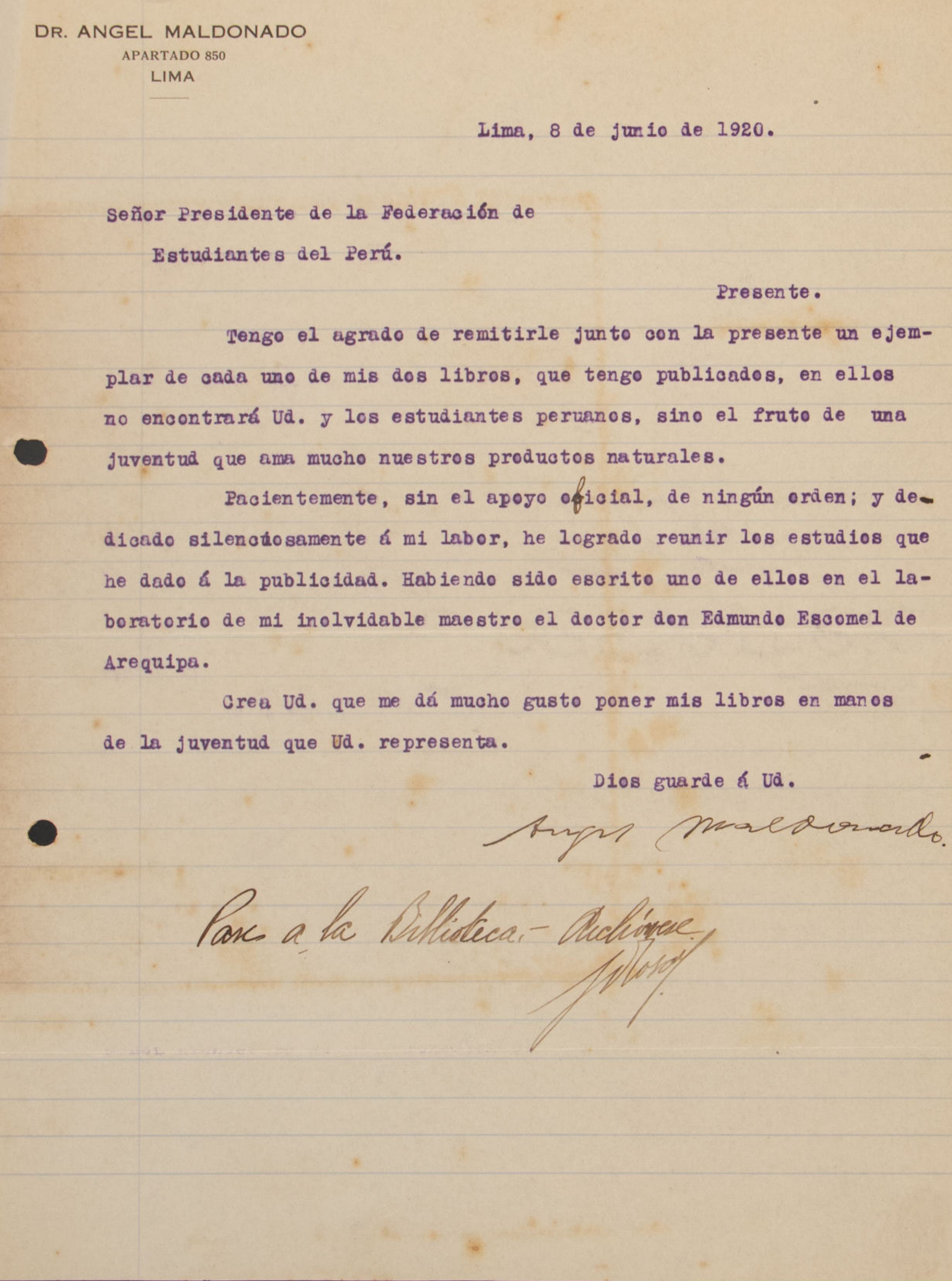 Carta de Ángel Maldonado al presidente de la Federación de Estudiantes del Perú