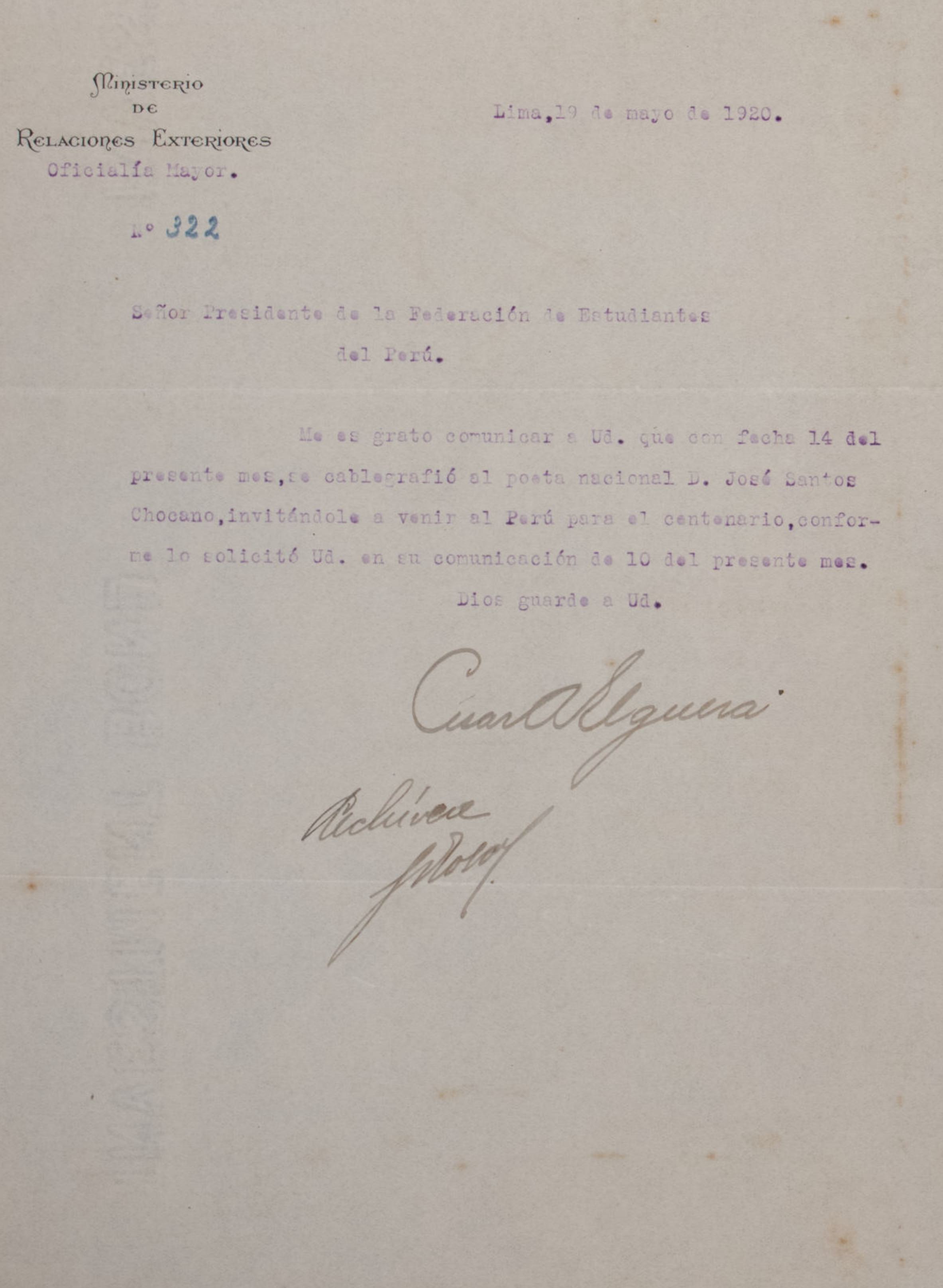 Carta enviada desde La Paz el 8 de noviembre de 1920 por un representante de la juventud nacional boliviana al presidente de la FEP. En ella, se informa que el señor Juan Manuel Sainz ha sido nombrado Vicepresidente de la institución representativa de la juventud boliviana, debido a su destacada labor y su contribución en la campaña durante la guerra de 1879. Se menciona la importancia de reconocer a Saldívar y se proponen otros nombres como Julio Téllez Reyes y Daniel Sánchez Bustamante para ocupar cargos en la federación. La carta enfatiza el deseo de fortalecer las relaciones con la Federación de Estudiantes del Perú.
