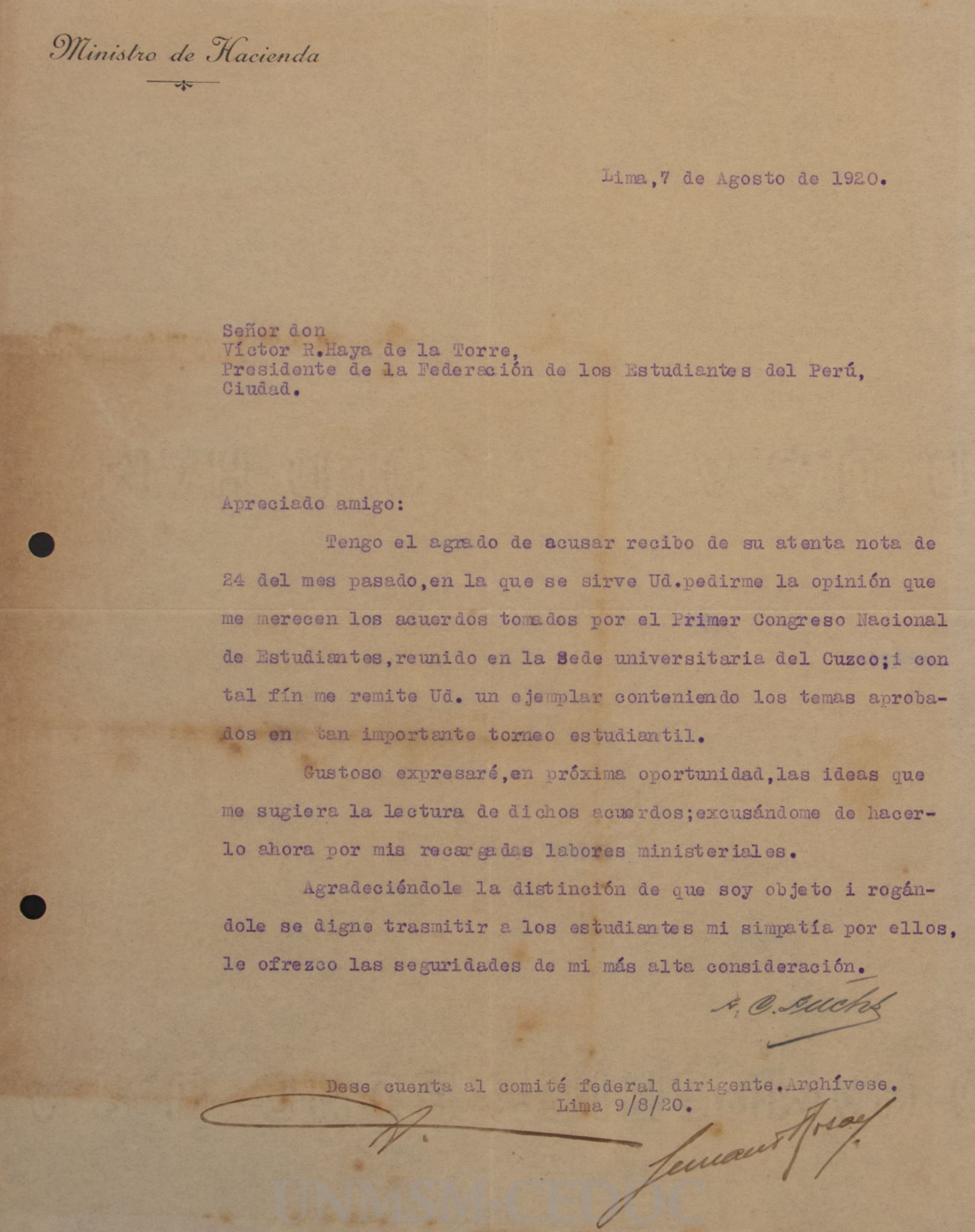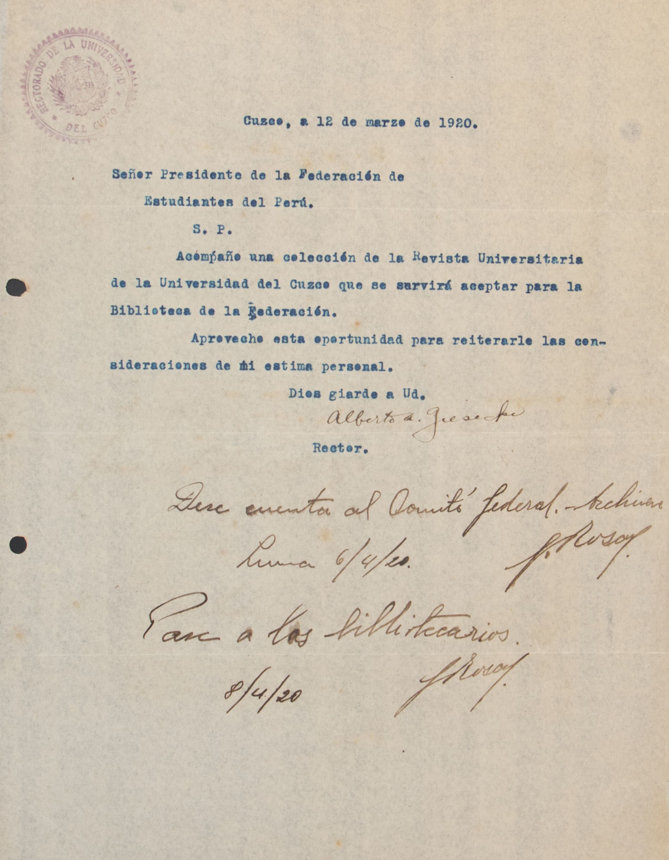 Centro de Ciencias Políticas informó al presidente de la Federación de Estudiantes del Perú sobre la elección de Augusto Rodríguez Larraín como su representante ante el Comité Federal, tras la renuncia irrevocable de Ricardo de la Puente Ganoza. La comunicación fue firmada por Ysmael Acevedo y Criado, presidente del centro.