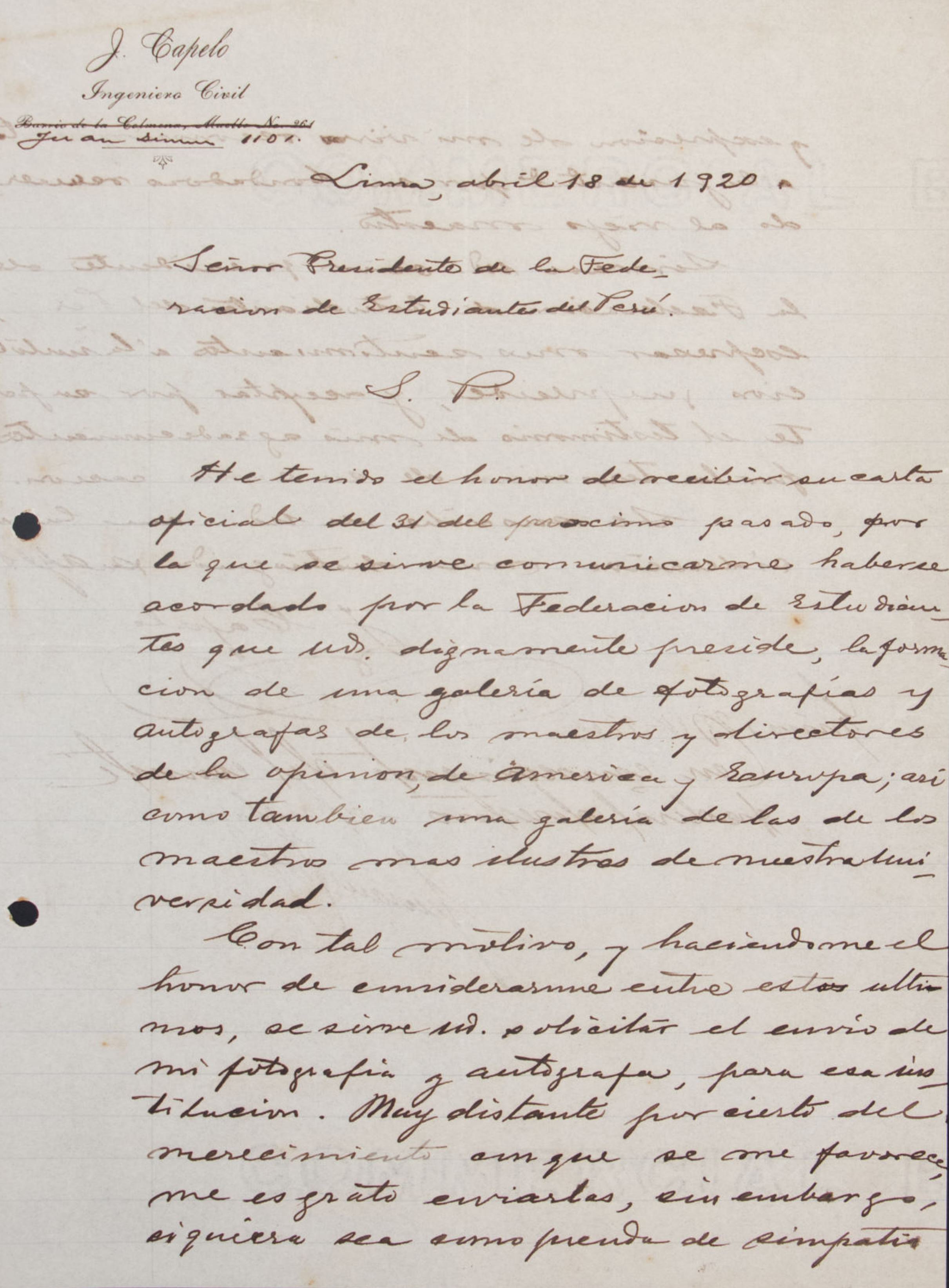 El rector de la Universidad de Trujillo, Bolaños, envió un telegrama el 23 de noviembre de 1920 al presidente de la Federación de Estudiantes del Perú, expresando un voto de aplauso y gratitud por el apoyo brindado a la participación del delegado de dicha universidad.