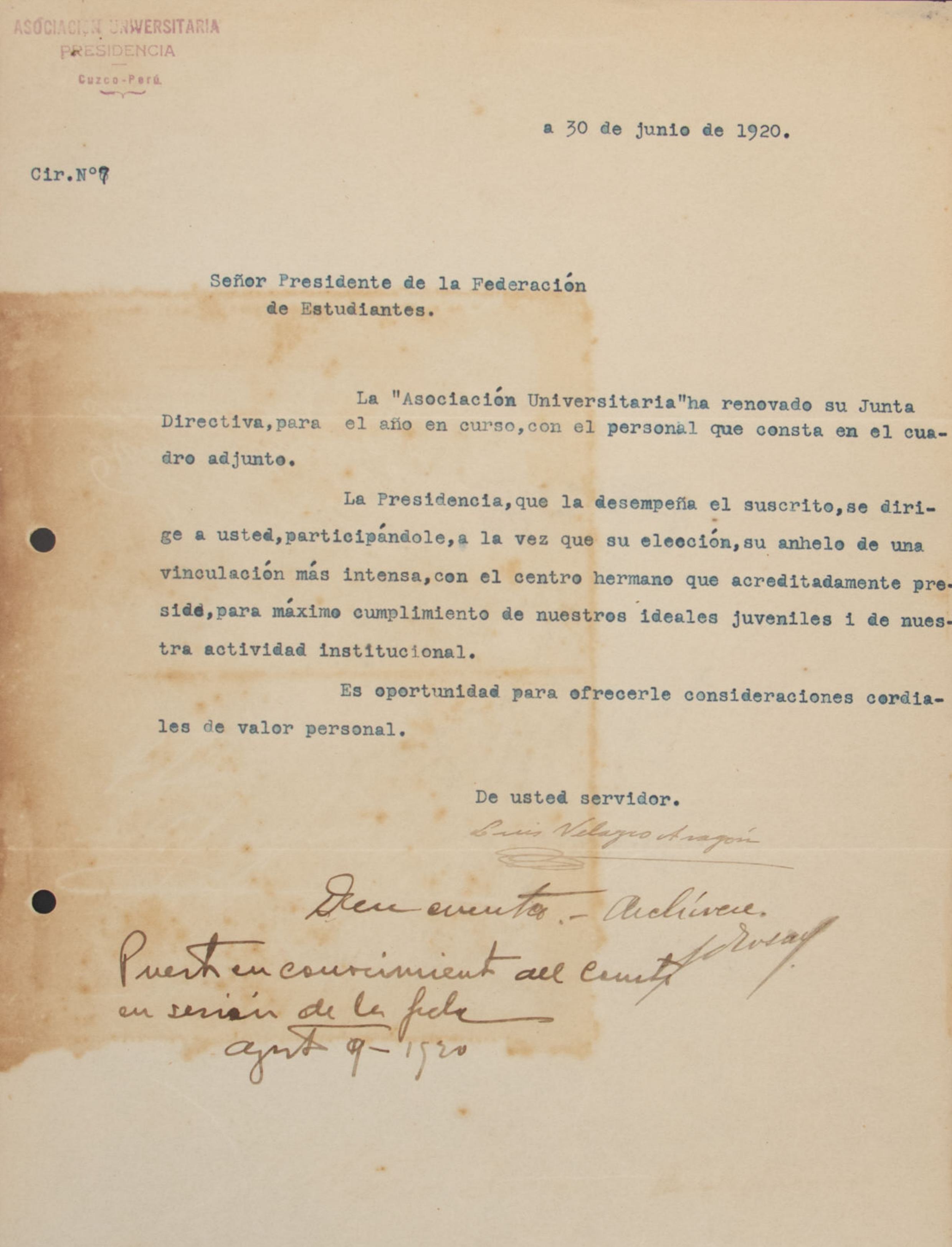 Propuesta para conceder el título de Miembro de Honor de la FEP a los integrantes del Comité Universitario Pro Defensa de la Paz en América y Derechos del Perú, con sede en Argentina, en reconocimiento a su labor en favor de la causa peruana. Se propone contestar su mensaje y enviar los diplomas correspondientes a través de la legación peruana en Argentina.