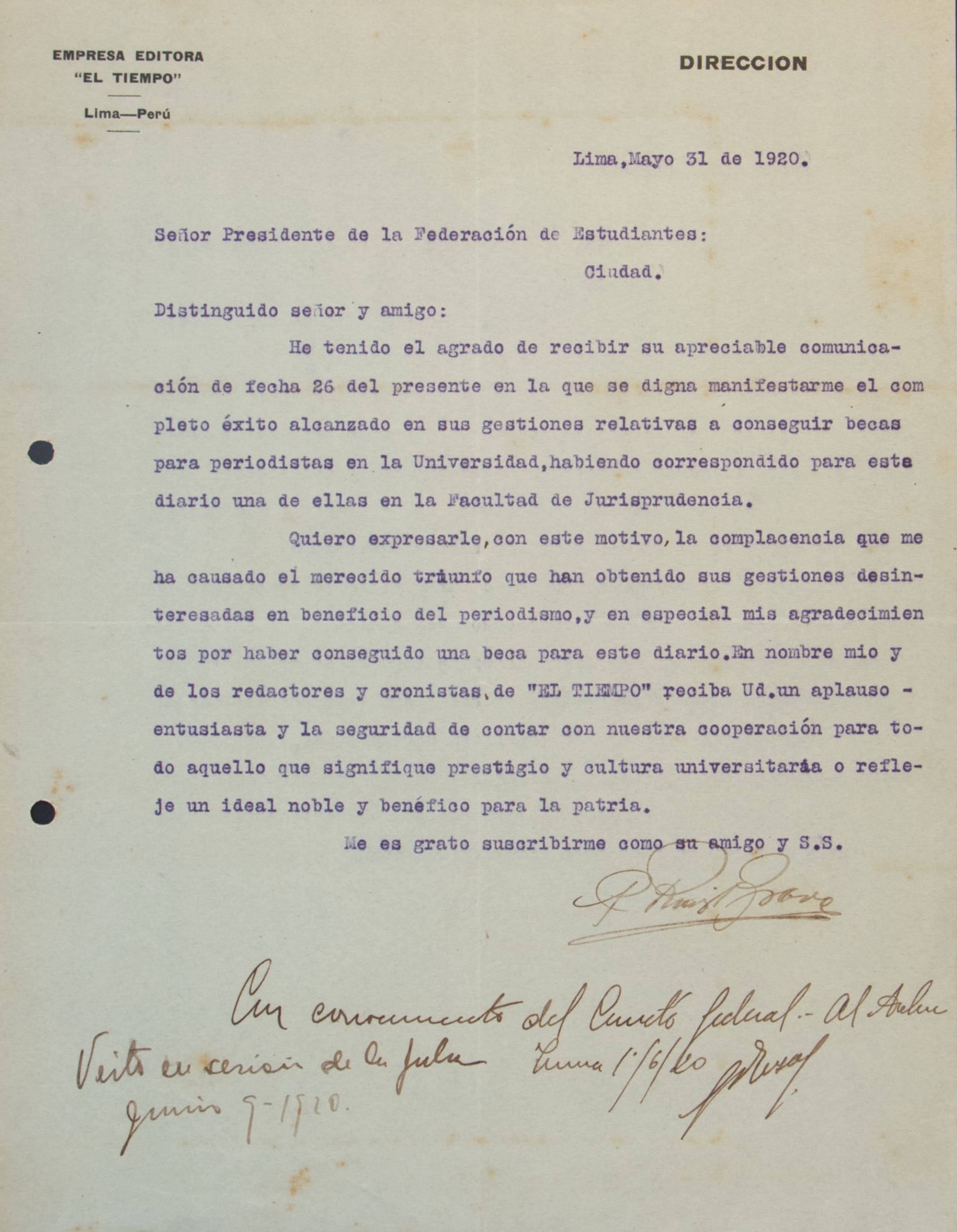 Invitación dirigida al presidente de la FEP para participar en las celebraciones del Centenario de la Independencia de Trujillo el 9 de diciembre de 1920, resaltando el homenaje a los héroes nacionales y la importancia de la presencia estudiantil en este acto histórico.