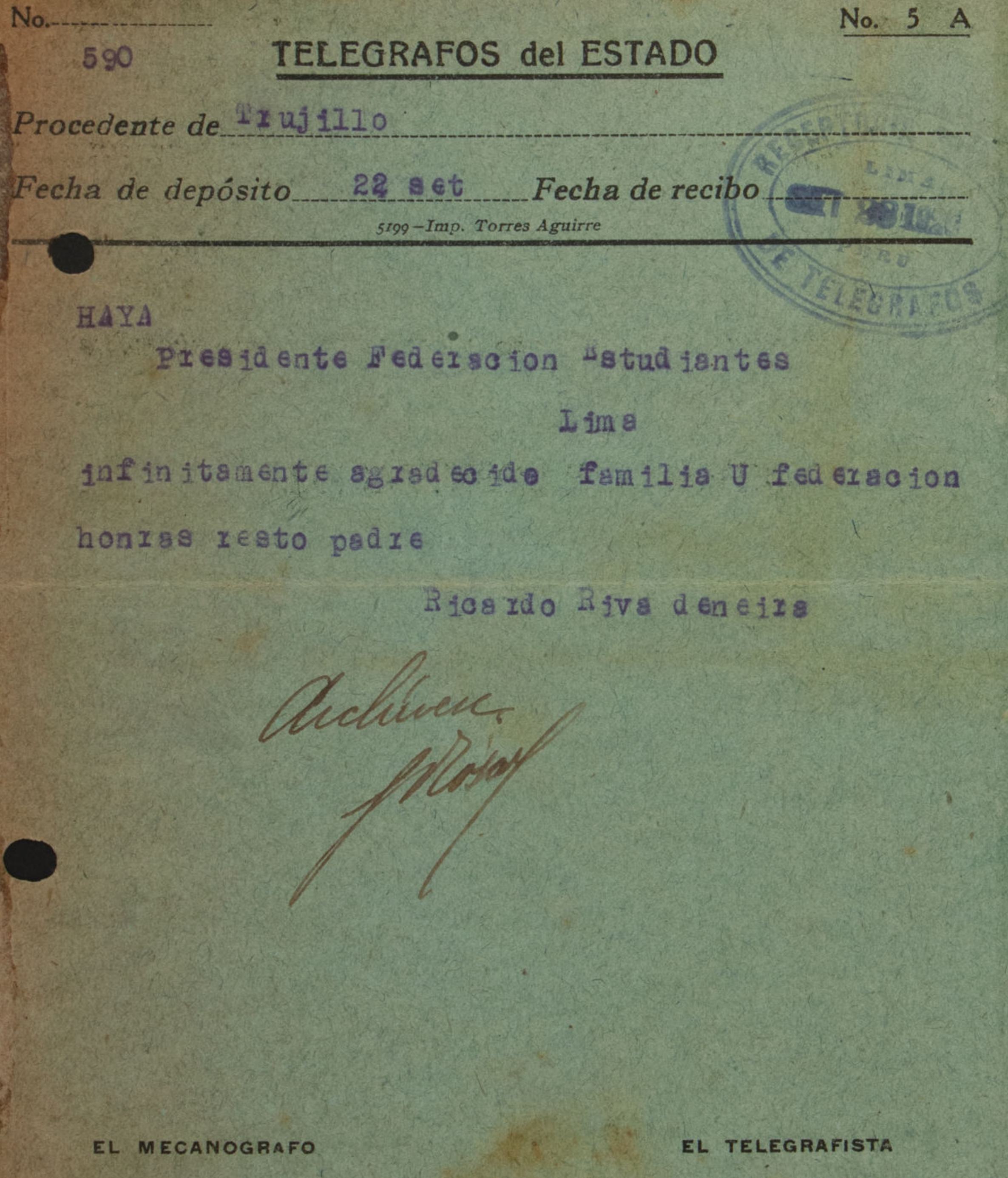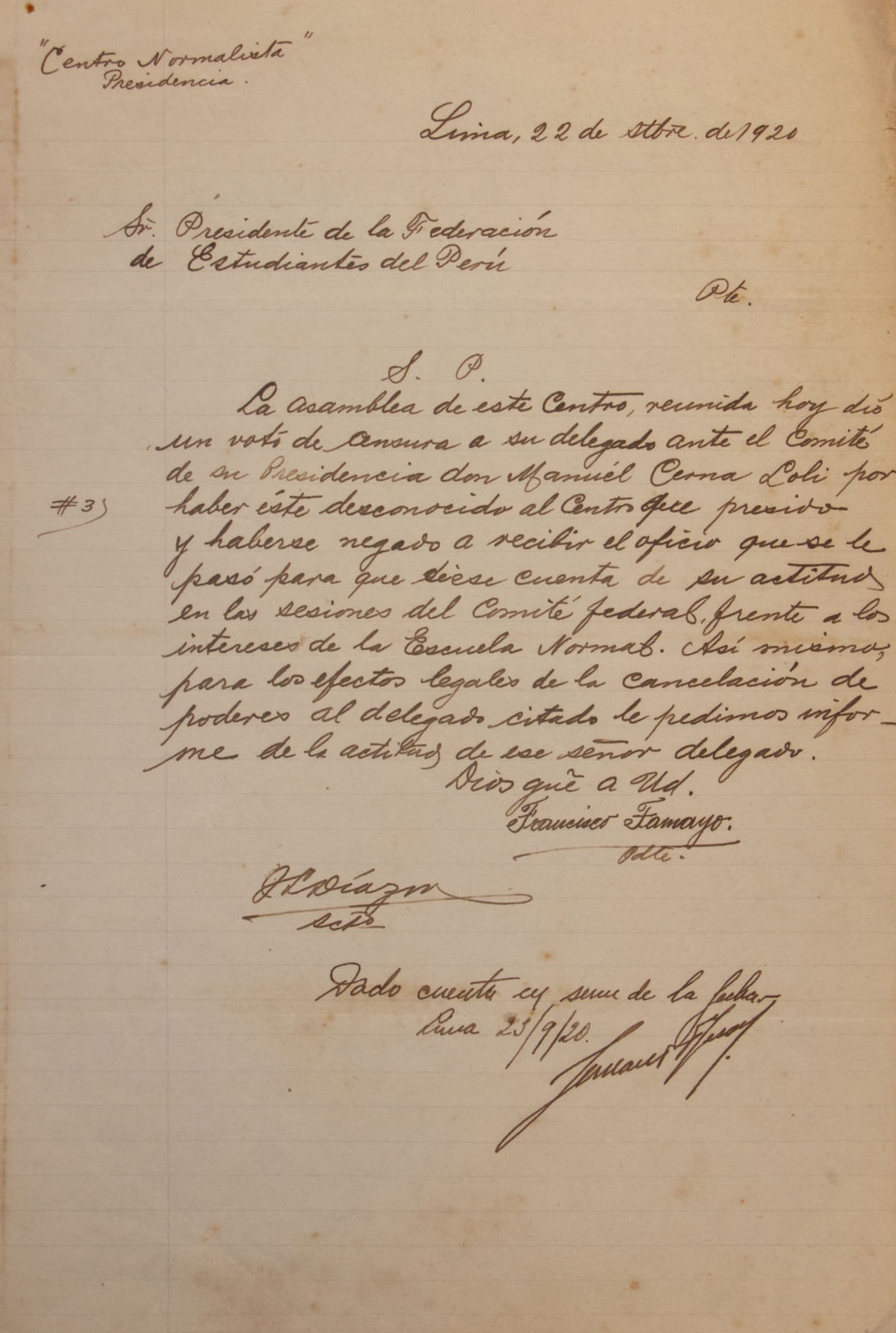 Carta enviada por los secretarios del Centro de Ciencias al presidente de la Federación de Estudiantes del Perú, en la que comunican el acuerdo unánime de la Junta Directiva para otorgar un voto de aplauso y confianza al presidente y al comité de la federación por su destacada labor profesional en favor de la juventud y del país.