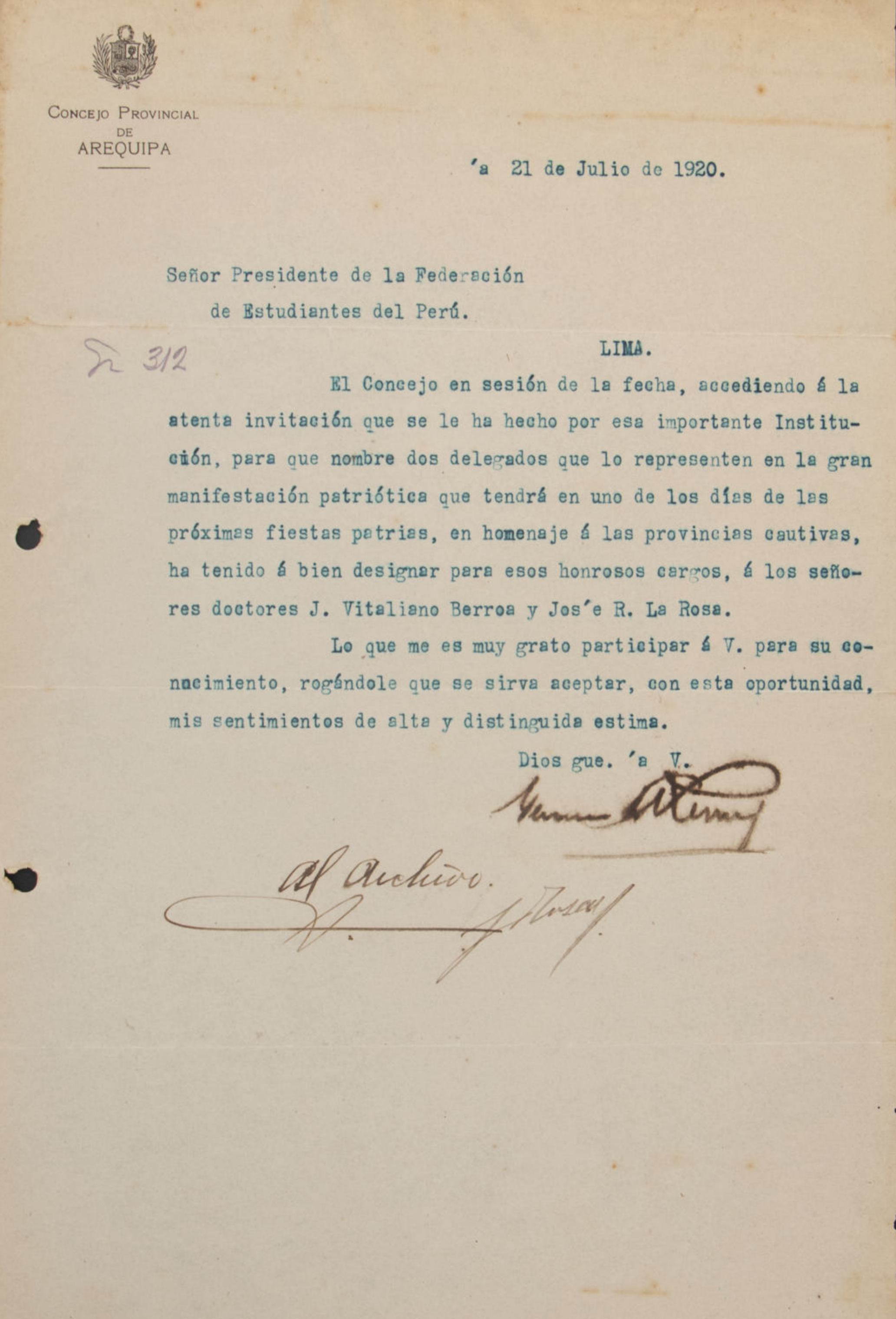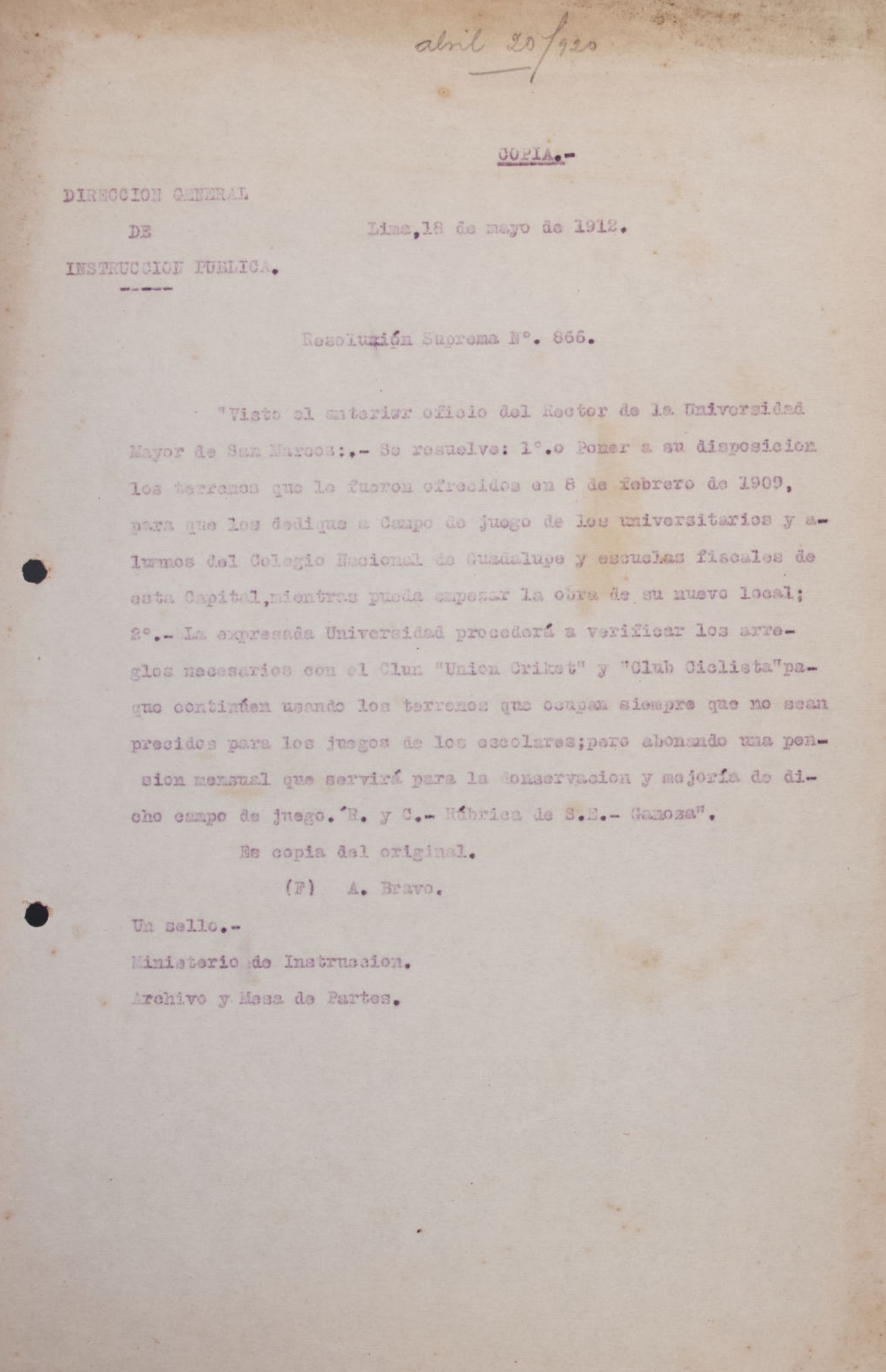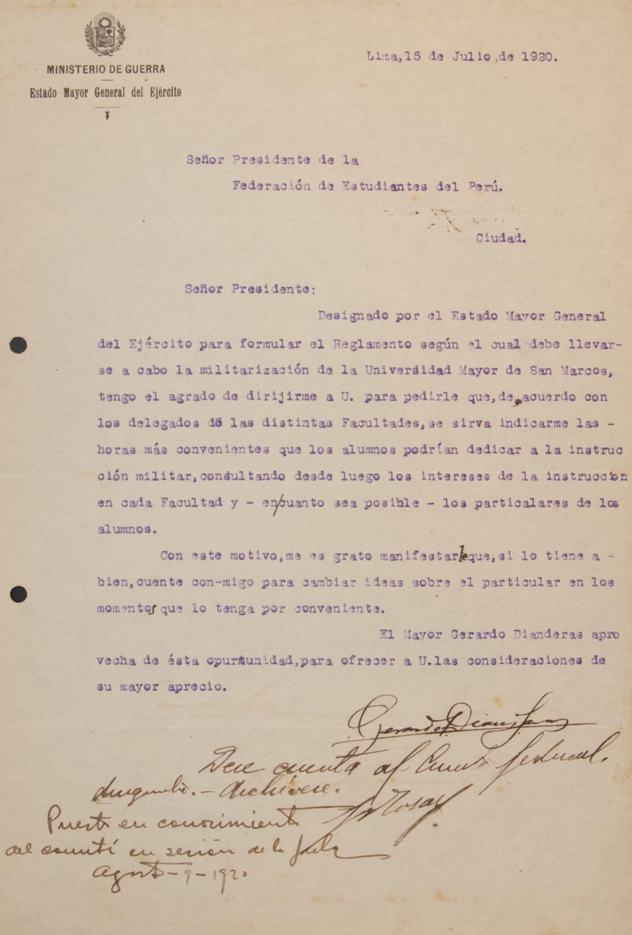 El rector de la Universidad Mayor de San Marcos comunica una invitación del director del Museo Nacional de Arqueología, P. Ainsworth Means, para que los estudiantes aprovechen las dependencias del museo durante las vacaciones universitarias, con fines de estudio y experimentación en arqueología y cultura.