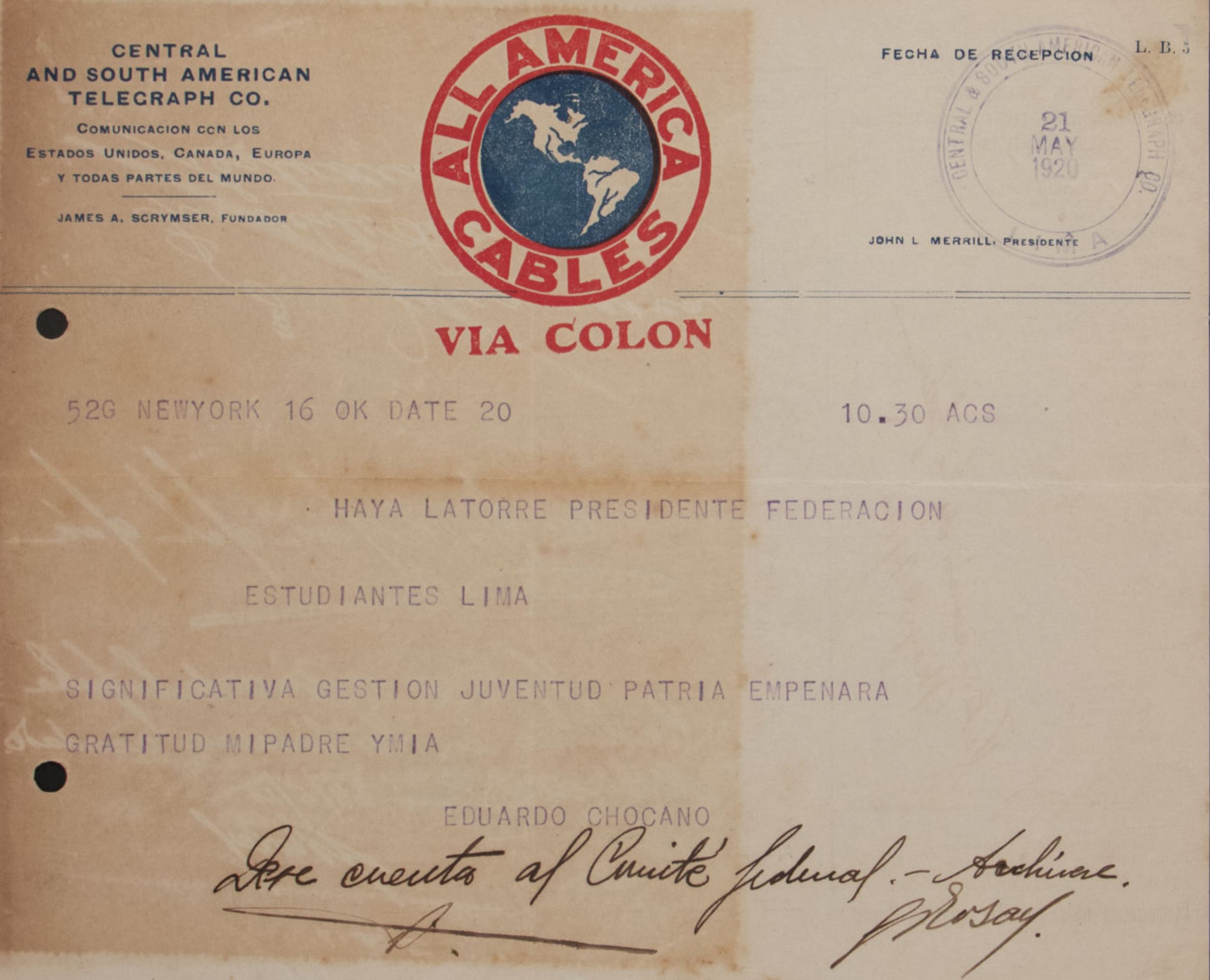 Esta carta, fechada el 19 de febrero de 1920 y dirigida al presidente de la Federación de Estudiantes del Perú, proviene del coronel director de la Escuela en Chorrillos. En ella, acusa recibo de un oficio enviado el 11 de febrero junto con el cuadro de los miembros del comité dirigente de la federación. El director expresa su apoyo a los objetivos de la federación y formula sus mejores deseos para que las orientaciones y actividades de la FEP contribuyan al progreso y desarrollo que los estudiantes persiguen. Además, ofrece su colaboración incondicional y expresa su estima hacia la federación y sus líderes.