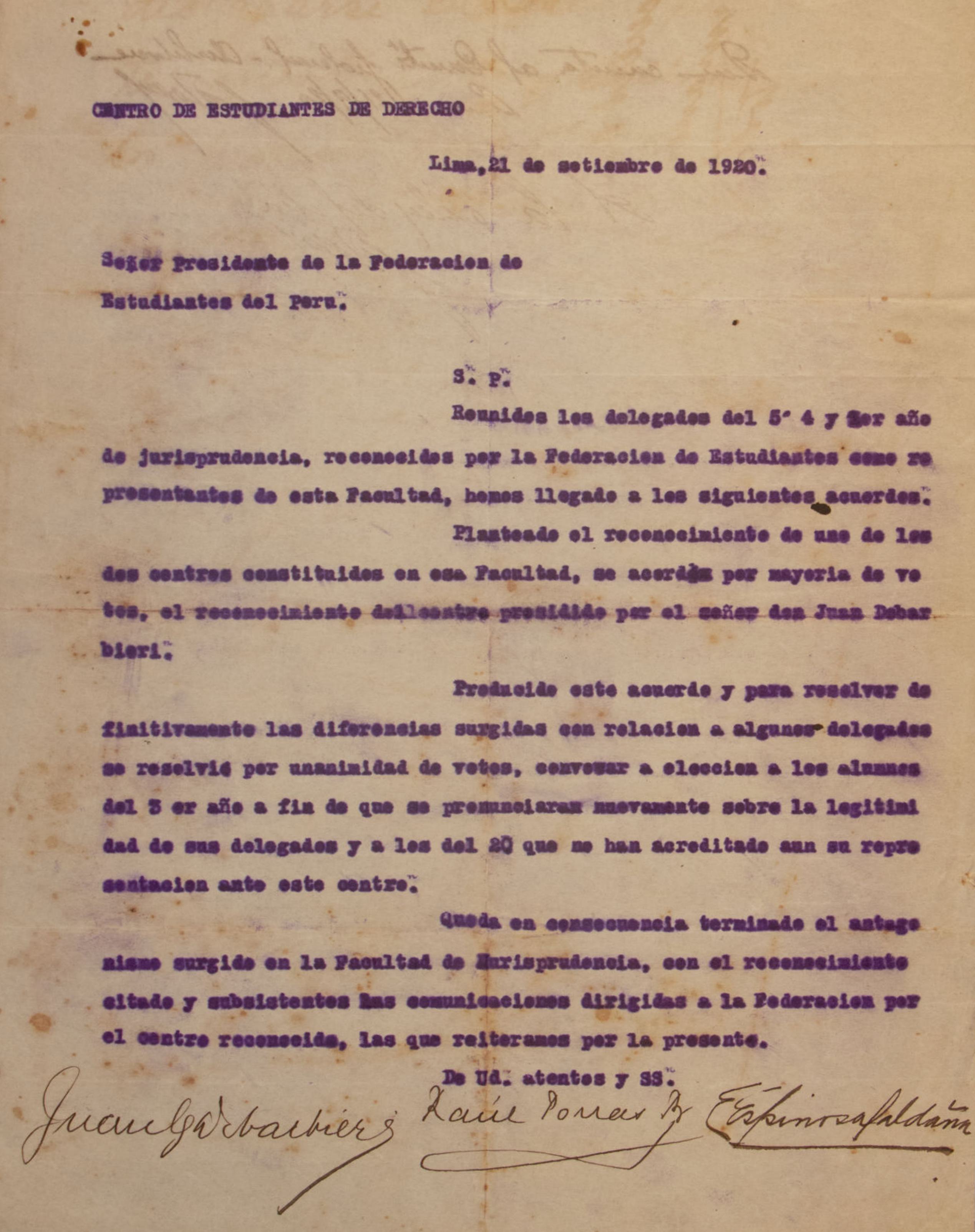 Esta carta, fechada el 2 de marzo de 1920 y dirigida al presidente de la Federación de Estudiantes del Perú en Lima, es enviada por Benjamín Chirinos Pacheco, presidente del Centro Universitario de Arequipa. La carta destaca la actuación patriótica y competente de Alberto Rey y Lamas, quien en su visita a diversas ciudades de España ha representado dignamente al Perú y a la federación. Además, se informa que Rey y Lamas cumplió con éxito el encargo de la federación de saludar a la juventud francesa a través de los estudiantes de la Universidad de París. Chirinos Pacheco deja constancia de estos logros, resaltando el honor que representan tanto para el diplomático joven como para la juventud peruana.