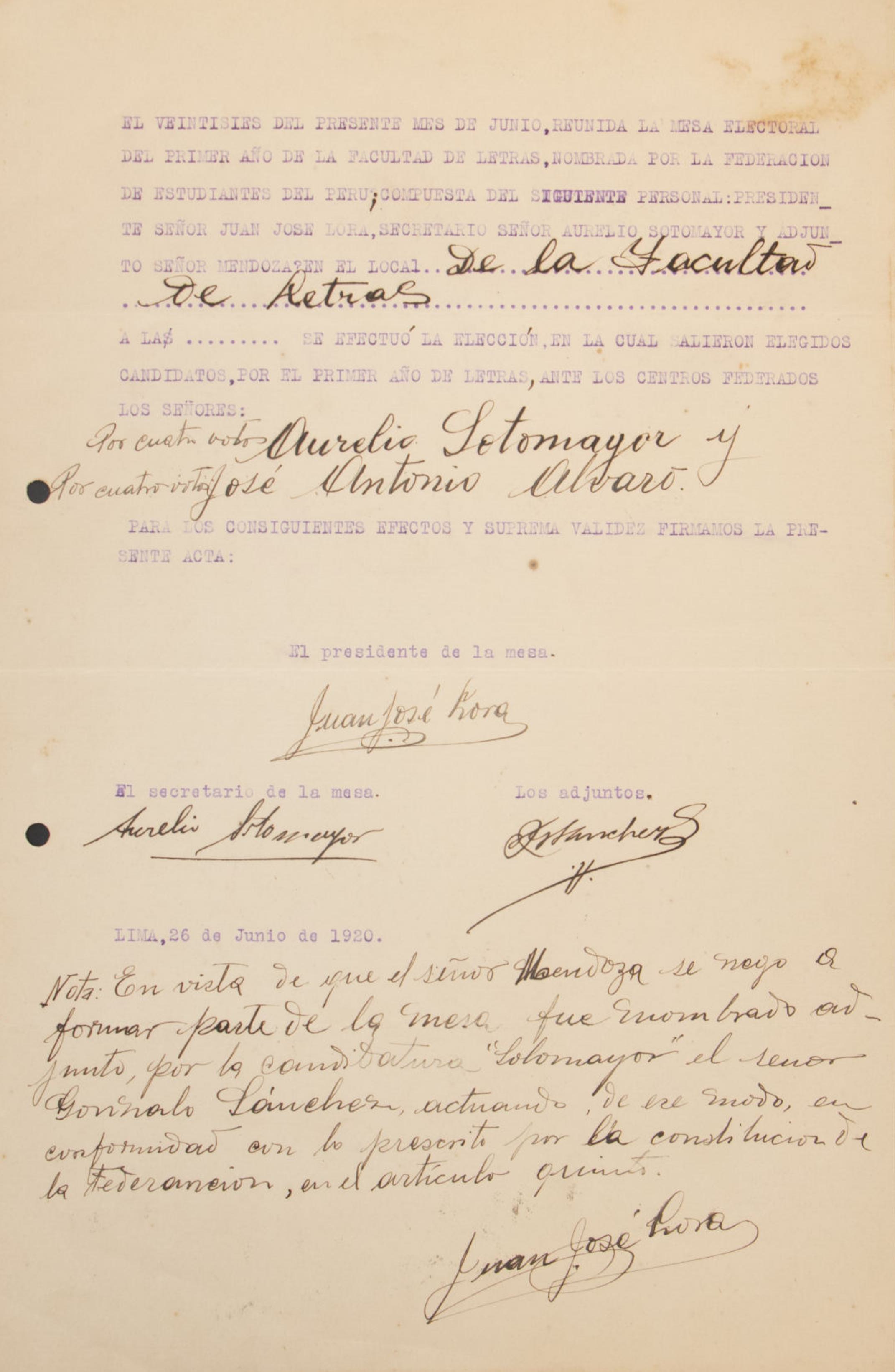 Esta carta, fechada el 28 de febrero de 1920 y dirigida a Raúl Haya de la Torre, presidente de la Federación de Estudiantes del Perú, es enviada por Angulo Puente Arias, que desea contribuir a la formación de la biblioteca estudiantil. En la misiva, el remitente incluye un ejemplar de sus libros "Legislación de minas" y "Legislación obrera", ambos anotados y concordados, y destaca que estos son el resultado de su esfuerzo personal por estudiar y organizar las leyes en su tiempo libre. Además, menciona que próximamente publicará "Legislación de aguas, Agricultura e irrigación", obra que también donará a la biblioteca estudiantil.