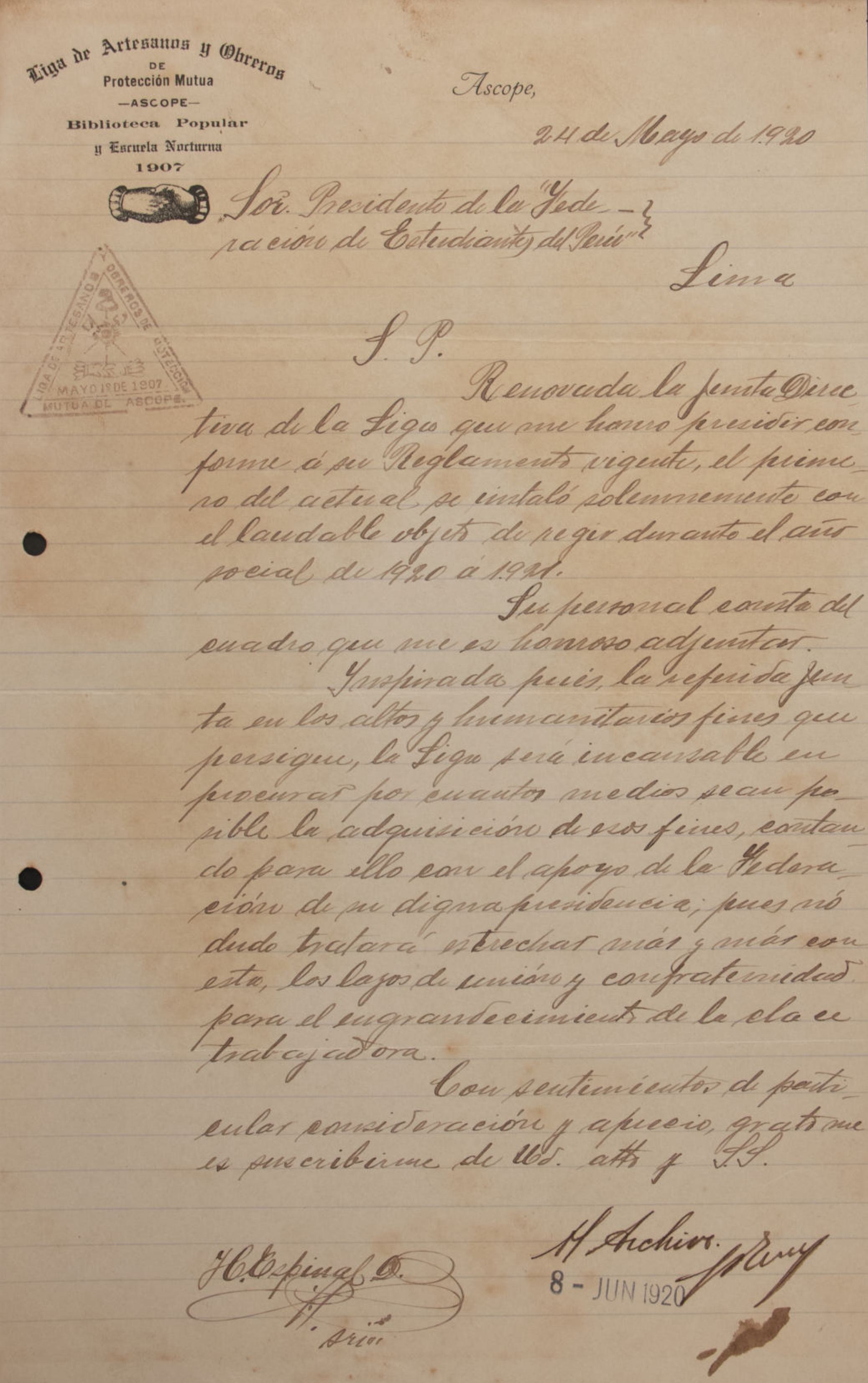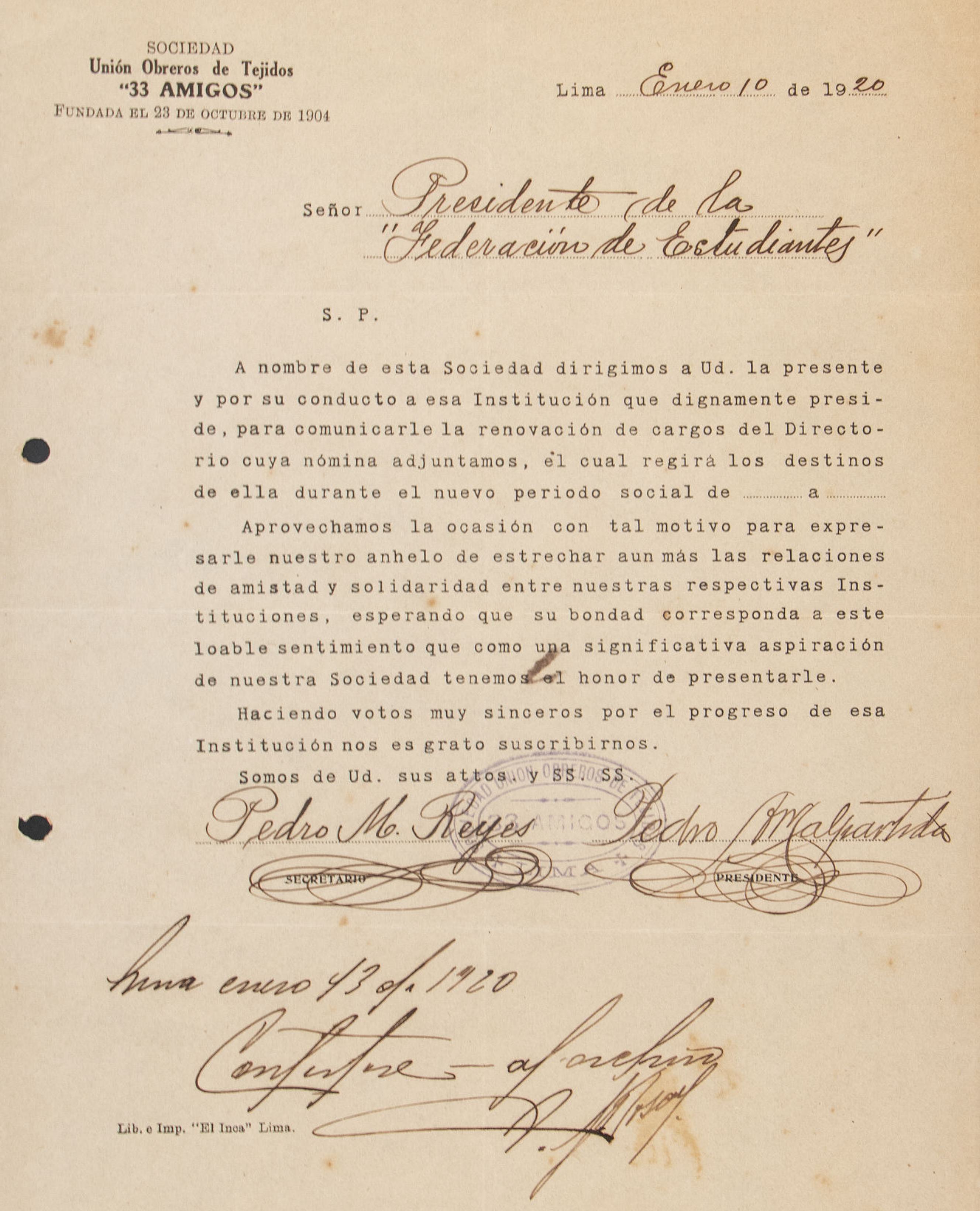 Carta dirigida al presidente de la Federación de Estudiantes del Perú el 14 de febrero de 1921, solicitando una licencia de treinta días debido a motivos de salud. El remitente solicita una pronta respuesta del comité respecto a la resolución de su solicitud.