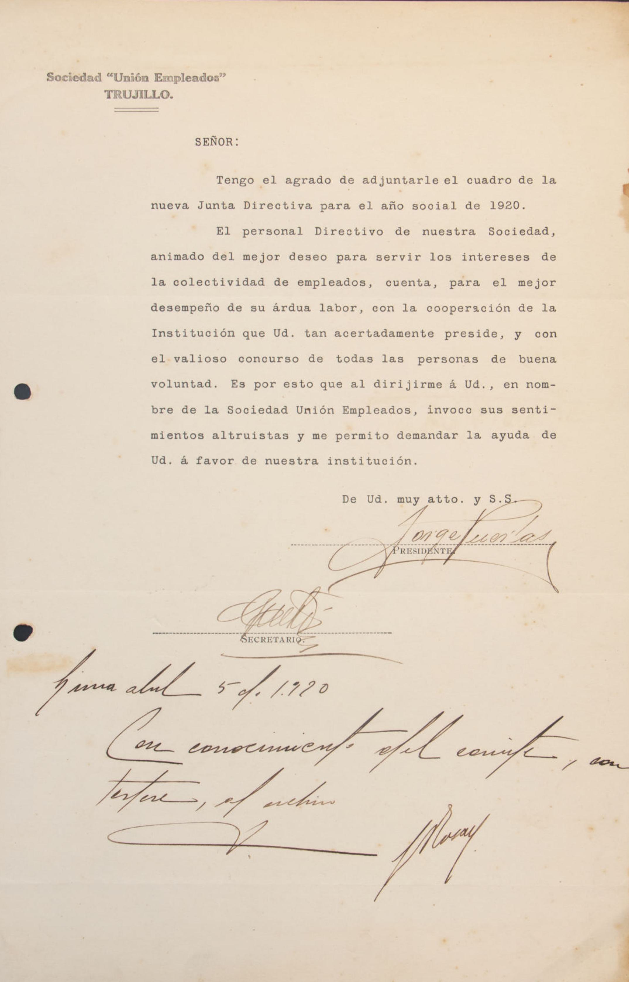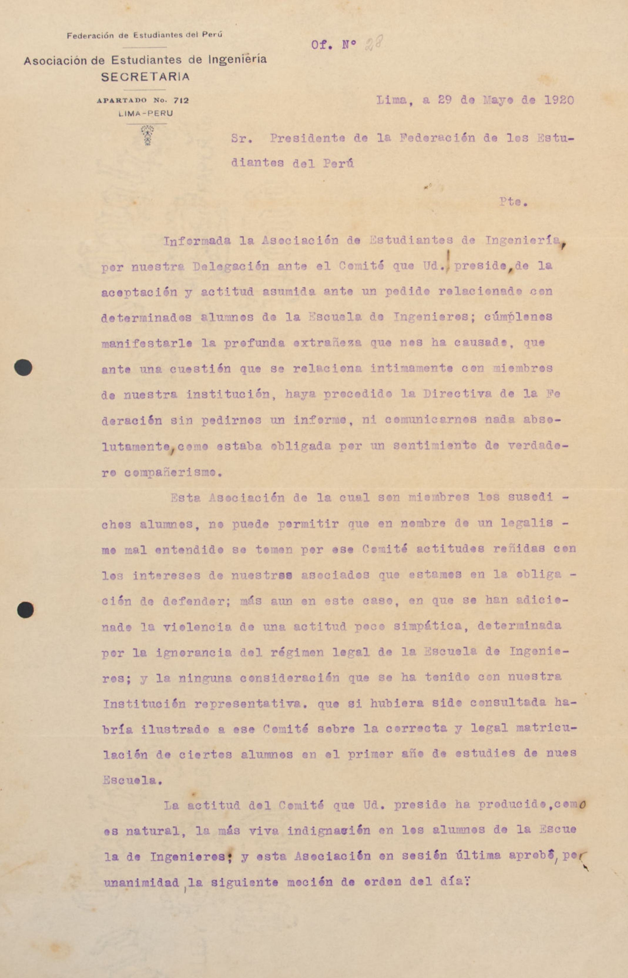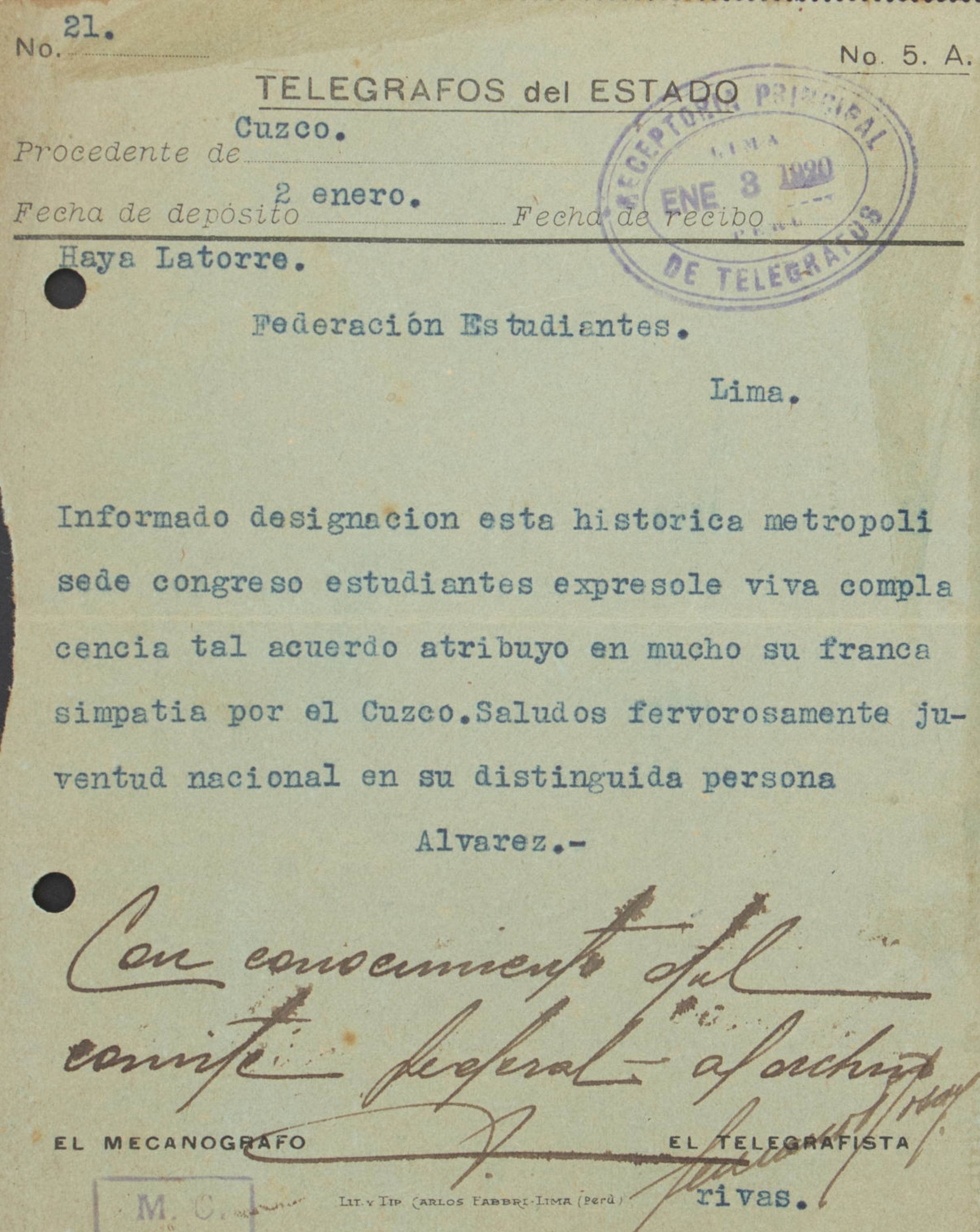 Carta enviada el 5 de enero de 1920 por Alfredo Herrera a los secretarios de la Federación de Estudiantes del Perú, donde solicita una copia del Reglamento del Congreso Nacional de Estudiantes, pues el próximo número de "Studium", revista de ciencias sociales editada por la Federación de Estudiantes del Perú, se ocuparía de ese evento.