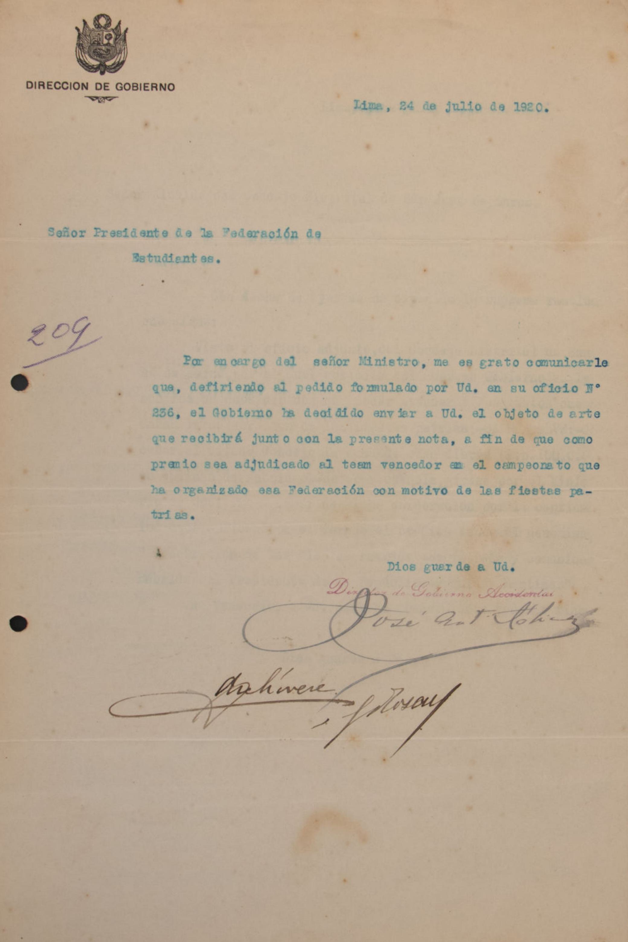 Esta carta, fechada el 4 de marzo de 1920 y dirigida a Víctor Raúl Haya de la Torre, presidente de la Federación de Estudiantes del Perú, es enviada por E. Gutiérrez de Quintanilla. El remitente se disculpa por la demora en su respuesta y felicita a Haya de la Torre por su iniciativa al frente de la federación. Además, informa sobre el envío de una serie de impresos, entre ellos, estatutos, reglamentos, catálogos y obras literarias, para enriquecer los recursos bibliográficos de la federación.