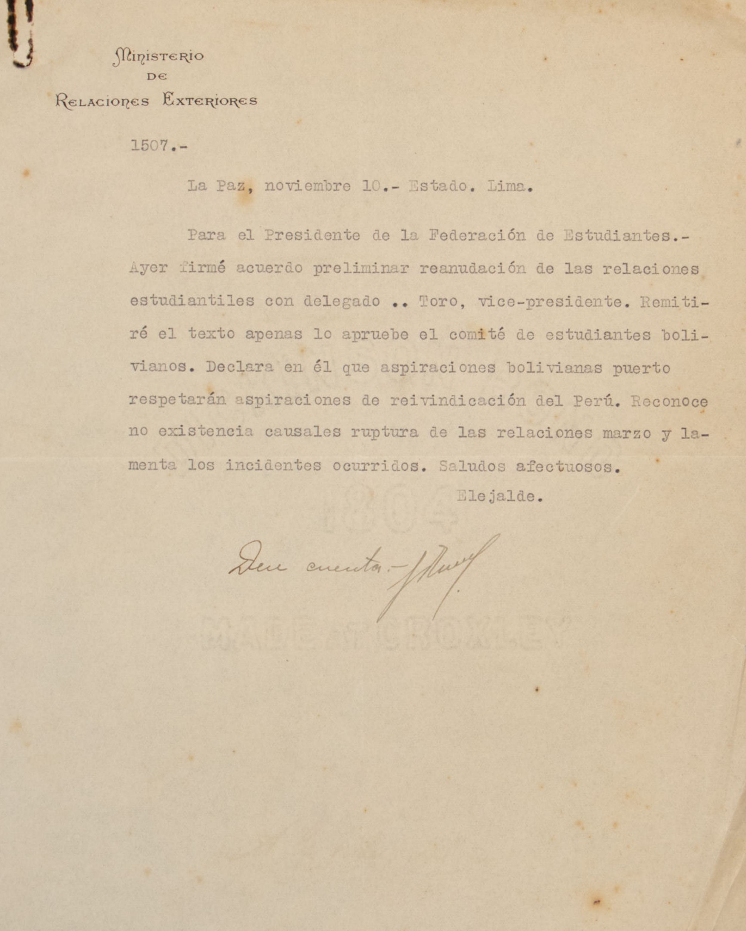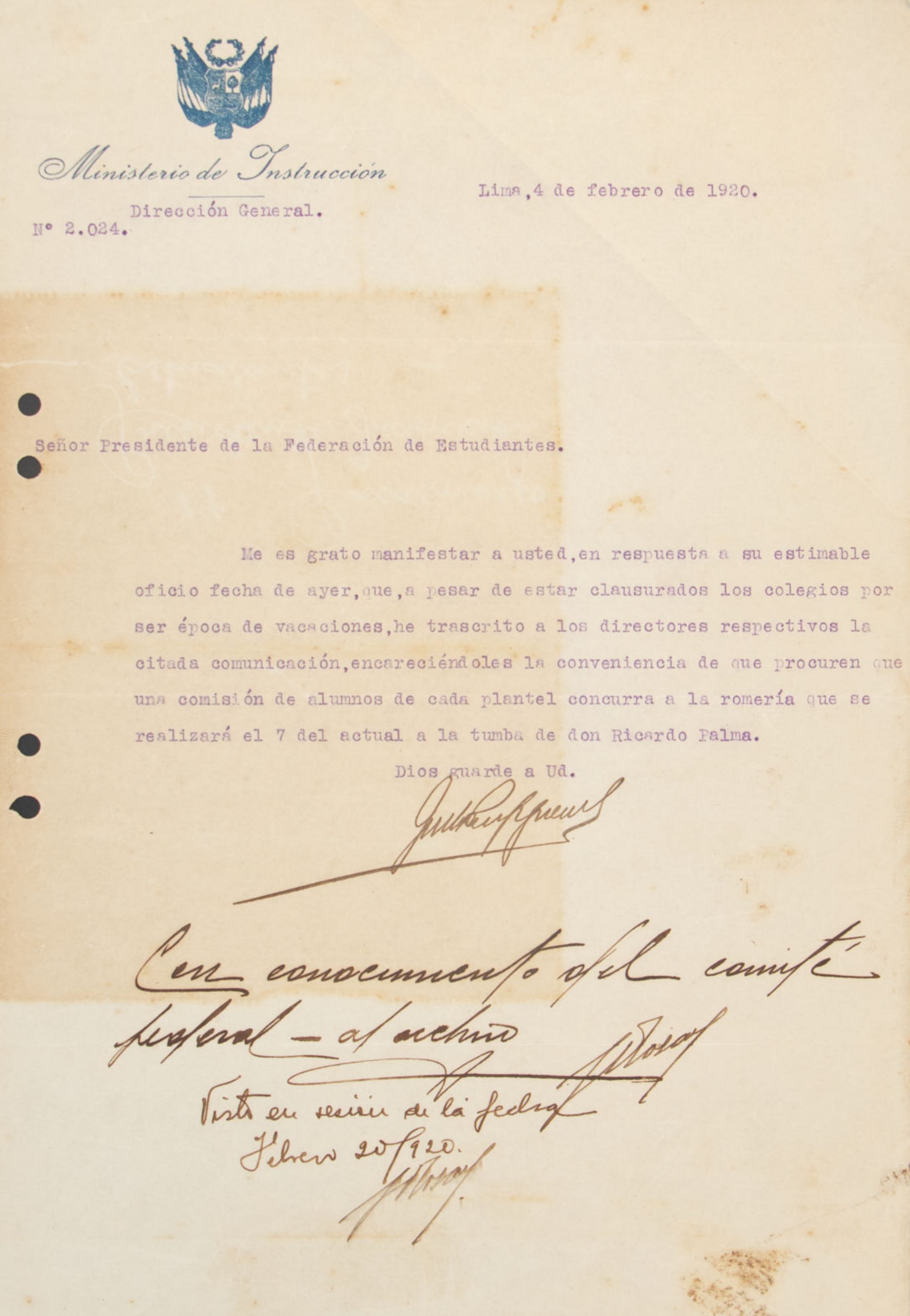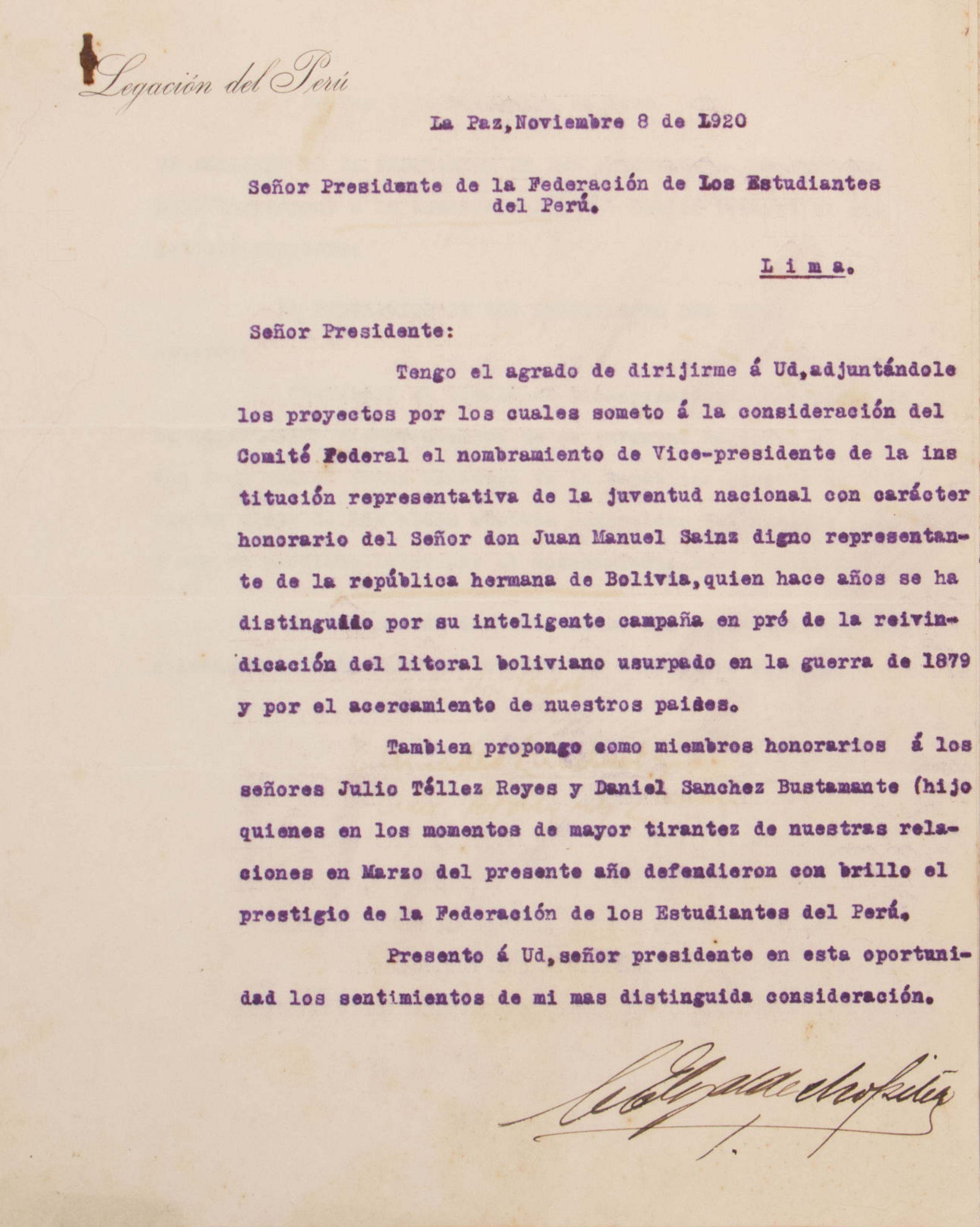 Propuesta presentada por el delegado Fernando Rosay el 7 de enero de 1921 para otorgar una gratificación del 50% de los haberes a los empleados de la Federación de Estudiantes del Perú con motivo de la festividad de Pascua.