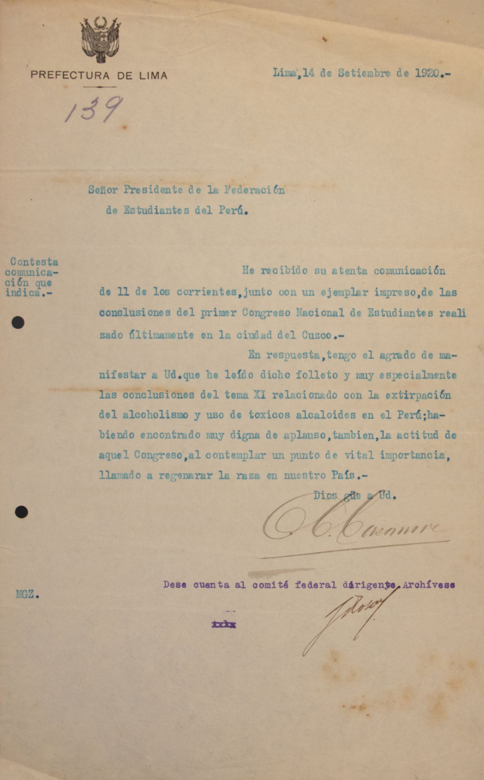 Carta de la Prefectura de Lima sobre las conclusiones del Primer Congreso Nacional de Estudiantes