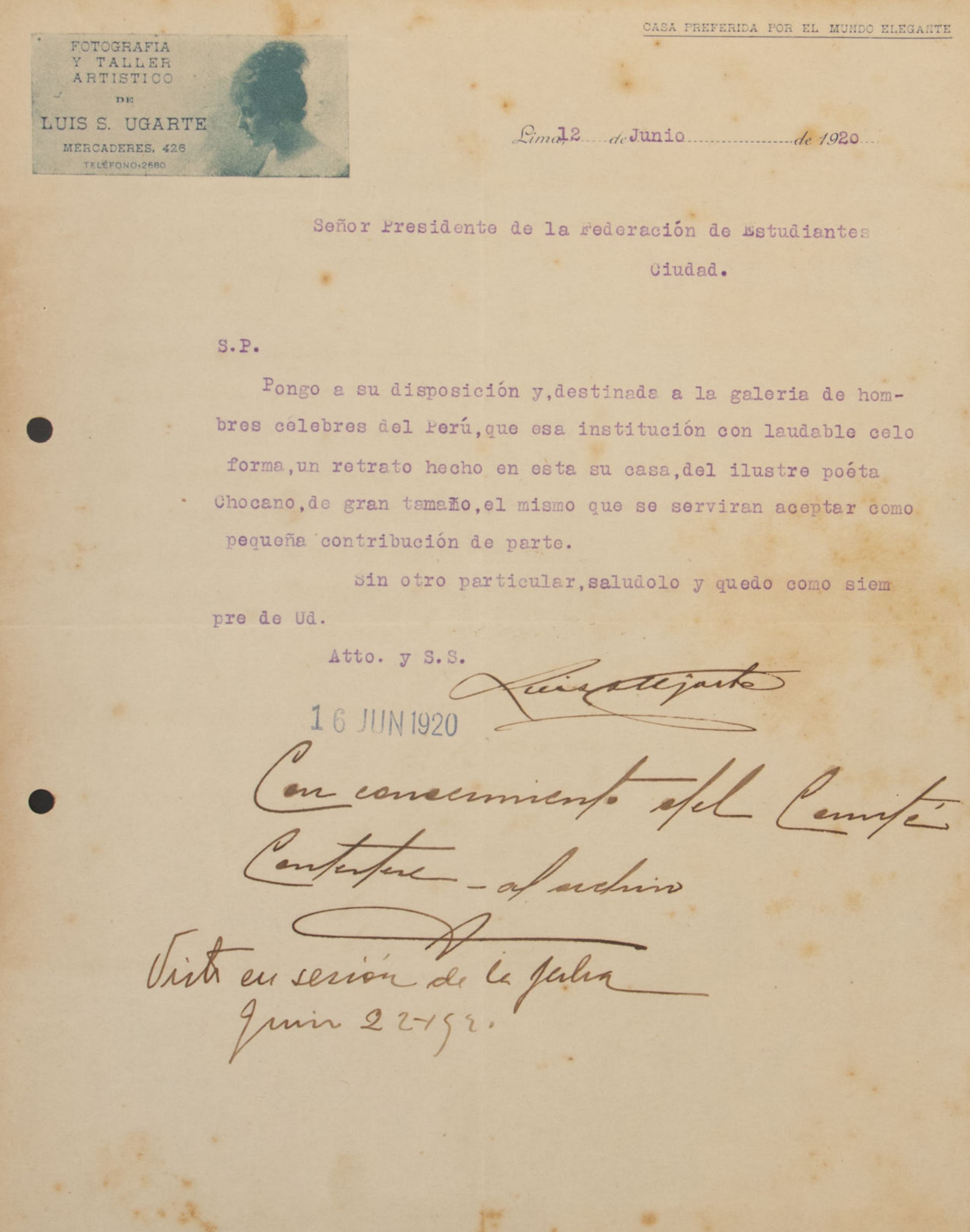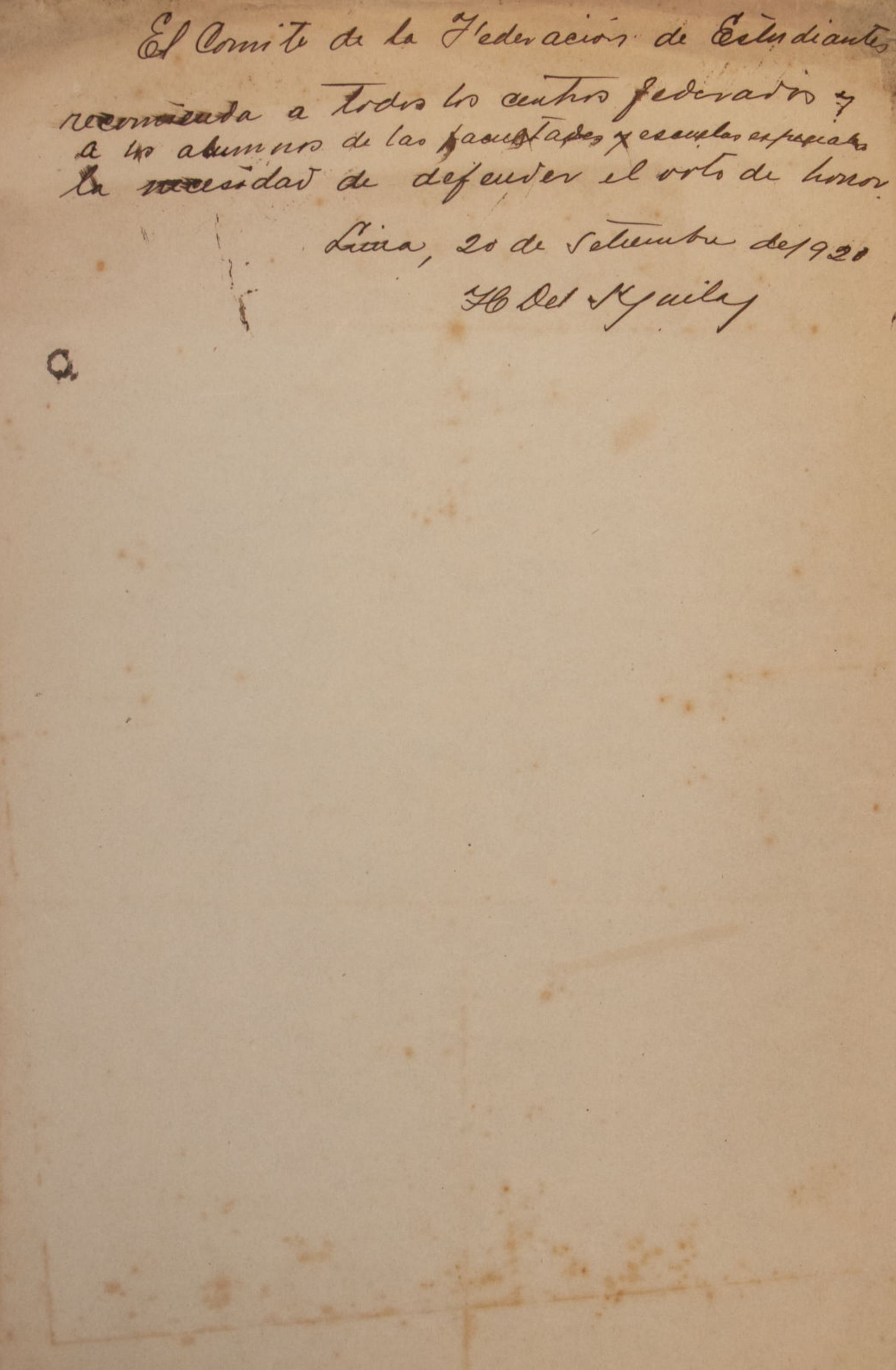 Esta carta, fechada el 12 de marzo de 1920 y dirigida al presidente de la Federación de Estudiantes del Perú, es enviada por Luna Iglesias. En la misiva, Iglesias expresa su satisfacción por haber llevado a buen término las gestiones ante el presidente de la República, quien facilitó los medios necesarios para que la Federación de Estudiantes del Perú pudiera inaugurar el primer congreso estudiantil en el país.