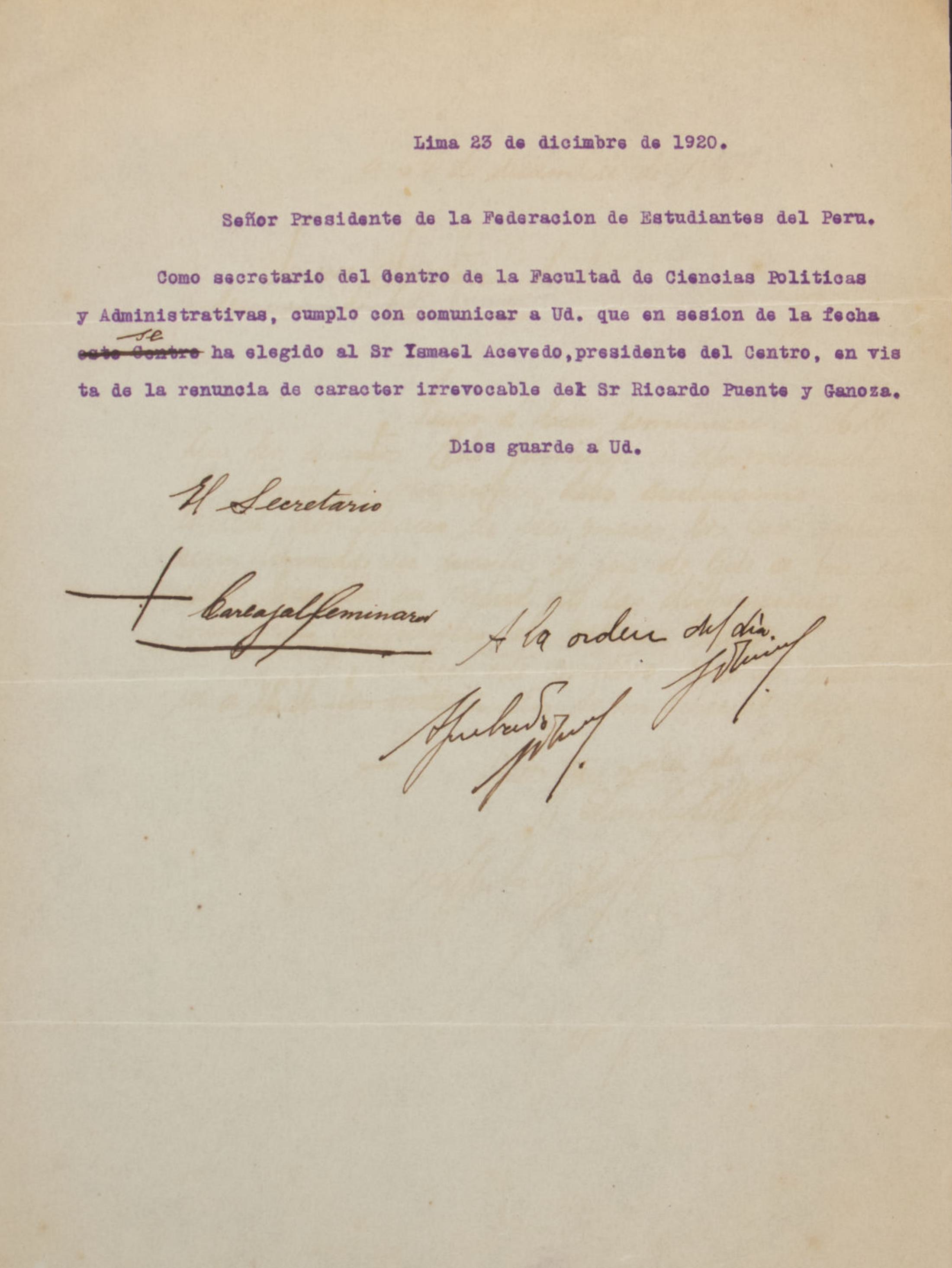 Este telegrama, enviado el 18 de marzo de 1920, informa a la Federación de Estudiantes del Perú en Lima sobre las discusiones en el Primer Congreso de la Federación de Estudiantes del Perú en Cusco.