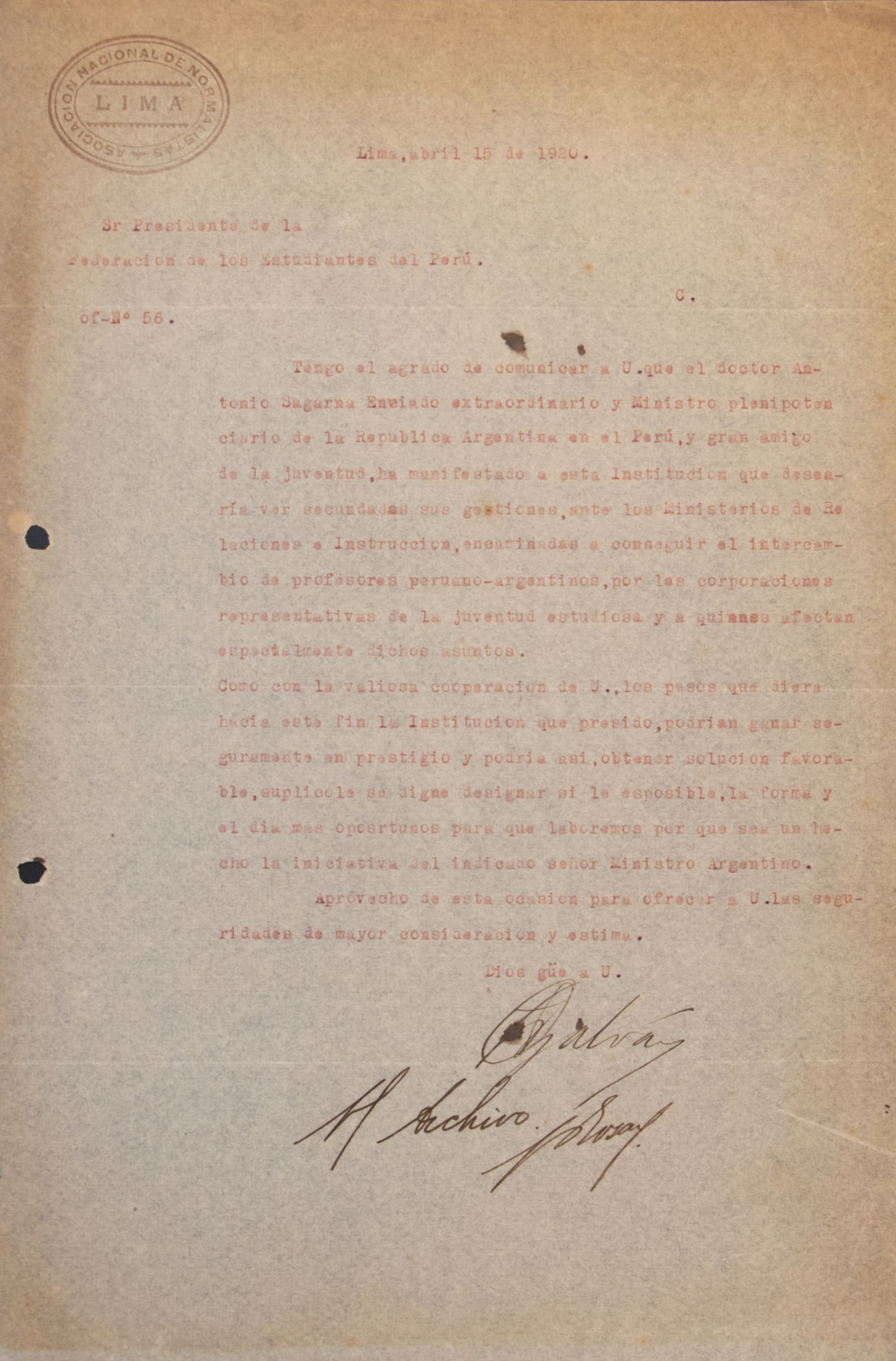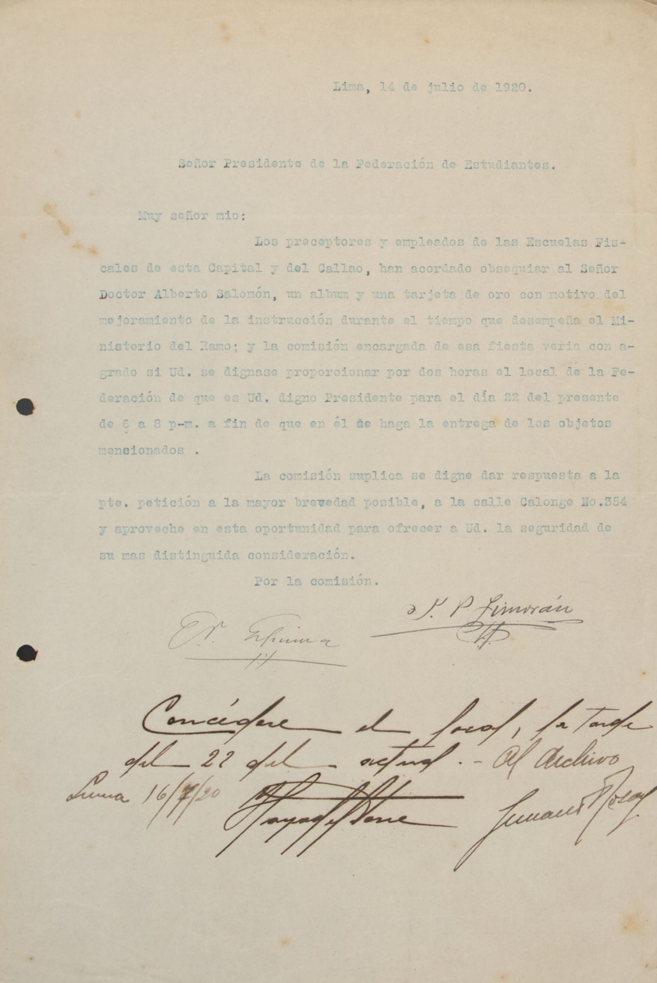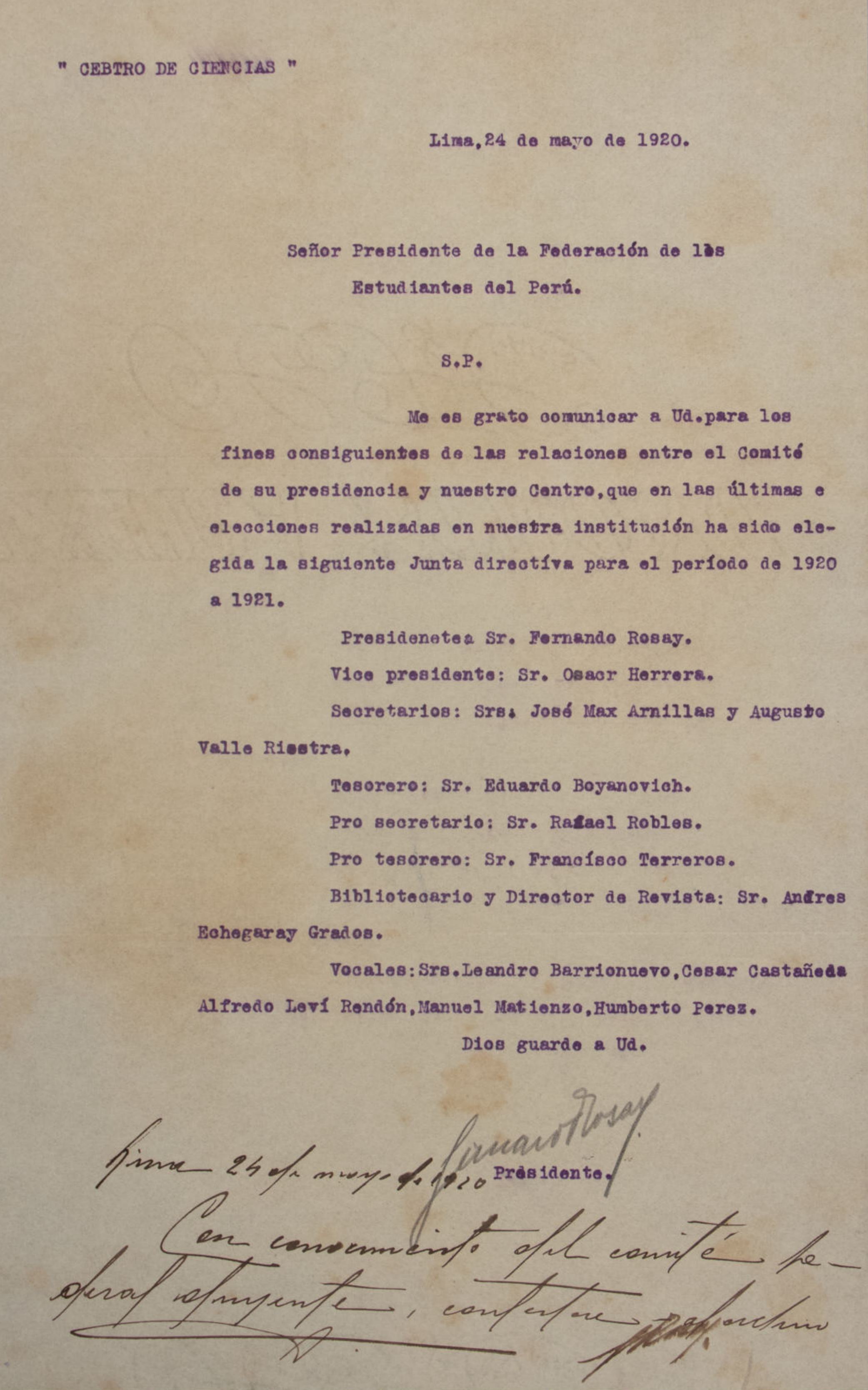 La carta, fechada el 7 de enero de 1920 y enviada por los representantes de la Universidad de Trujillo ante la Federación de Estudiantes del Perú, solicita de manera amistosa al presidente de la federación la convocatoria a una sesión extraordinaria, donde se aborde un pedido específico formulado por los estudiantes universitarios de Trujillo.