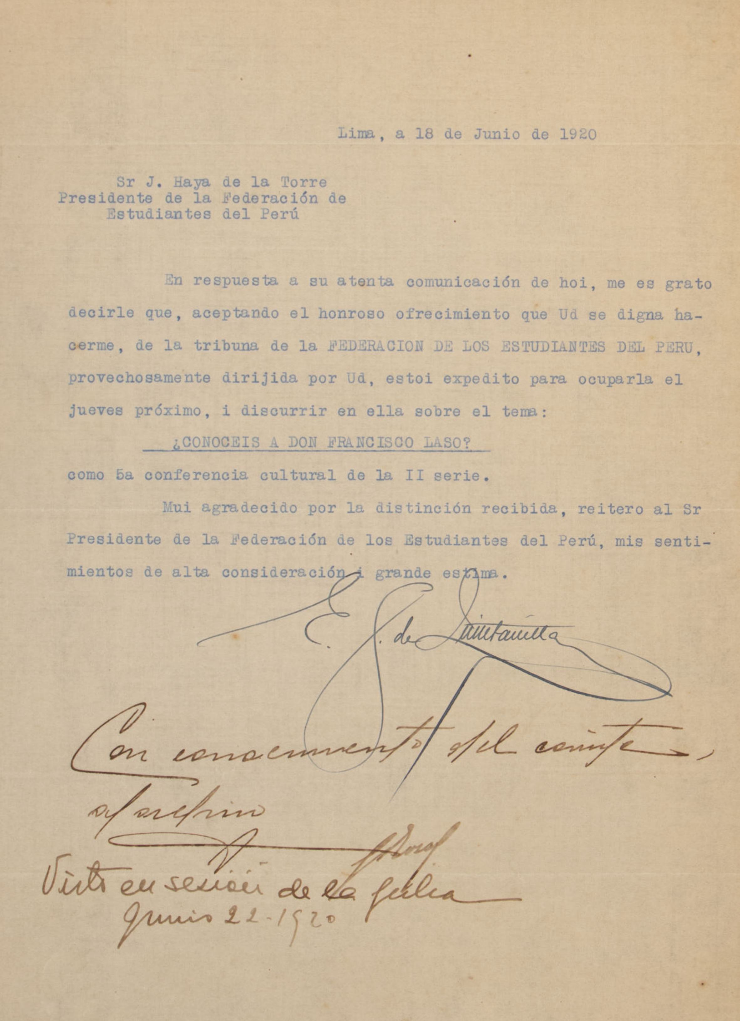 El memorándum, fechado el 28 de marzo de 1920, está dirigido al Secretario de la Federación de Estudiantes del Perú y explica los retrasos en la llegada de telegramas provenientes del congreso estudiantil en Cusco. La causa de los atrasos son las interrupciones en la línea telegráfica debido a fuertes lluvias. El documento informa que se ha dispuesto dar preferencia a la transmisión de estos mensajes para evitar futuros retrasos.