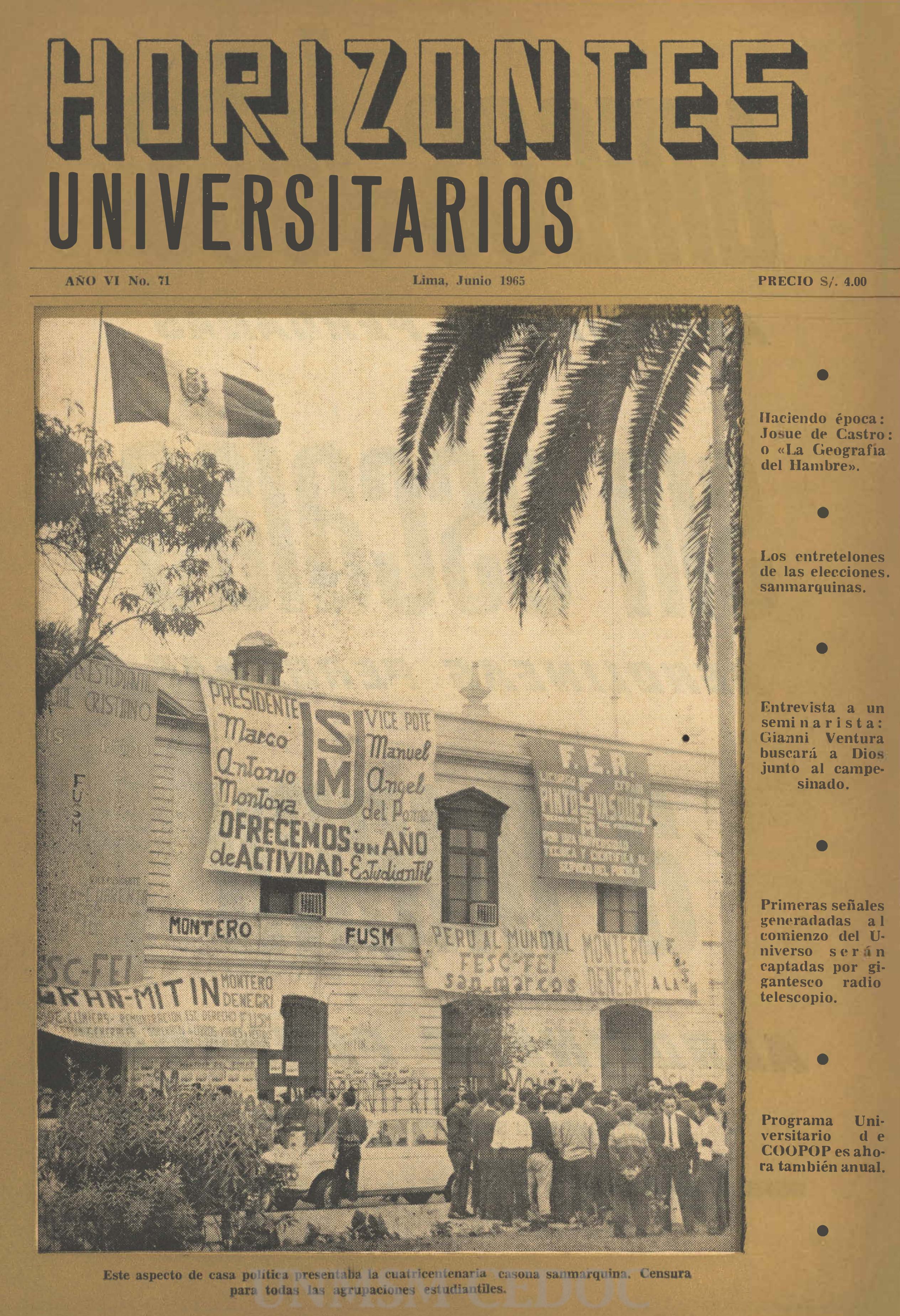 Publicación periódica de 1965, que contiene artículos de política y realidad nacional realcionado con las principales universidades del Perú