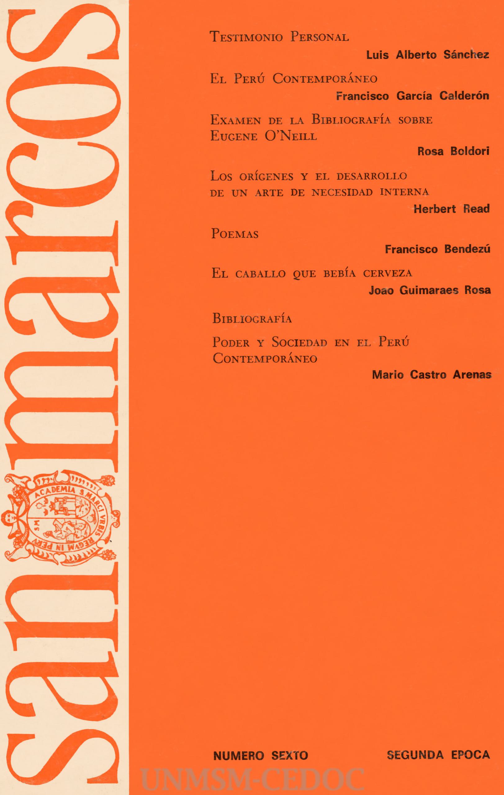 | dc.description.tableOfContents | Testimonio personal / por Luis Alberto Sánchez, p.7.-- El Perú contemporáneo / por Francsico García Calderón, p.17-- Examen de la Biliografía sobre Eugene O'Neil / por Rosa Boldori, p.31.-- Los orígenes y el desarrollo de un arte de necesidad interna / por Herbert Read, p.49.-- Poemas / por Francisco Bendezú, p.73.-- El caballo que bebía cerveza / por Joao Guimaraes Rosa, p.81.-- Bibliografía, p.87.-- Poder y sociedad en el Perú contemporáneo / por Mario Castro Arenas, p.90.-- |