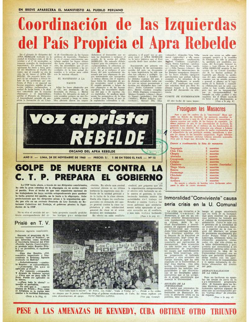 | dc.description.tableOfContents | Coordinación de las Izquierdas del país propicia el APRA Rebelde, p. 1.-- Prosiguen las masacres, p. 1.-- Golpe de muerte contra la C.T.P. prepara el gobierno, p. 1.-- Prialé en T. V., p. 1.-- Inmoralidad "conviviente" causa seria crisis en la U. comunal, p. 1.-- Cuba gana otra batalla / por Ricardo Napurí, p. 2.-- Una vivienda para cada cubano, p. 2.-- Solicitud al ministro de Asuntos Indígenas. / Antifidelismo militante. / Egoísmo oligárquico. / Pagaron conferencia a Luis Alberto (Hechos y Cosas), p. 2.-- Nace en Colombia la palabra revolución / por Plinio Apuleyo Mendoza, p. 2.-- Betancourt por el camino de la dictadura / por Mario Malpica, p. 2.-- El M.I.R.: Una esperanza venezolana, p. 3.-- Detienen a 2 compañeros rebeldes y decomisan nuestro periódico, p. 3.-- Ayabaca: Otra masacre campesina, p. 3.-- Políticos del "Ochenio" aprovechan el Comité de Defensa del Petróleo, p. 3.-- A. Tello y H. Pretell, prisioneros de la oligarquía consiguieron su libertad, p. 4 |